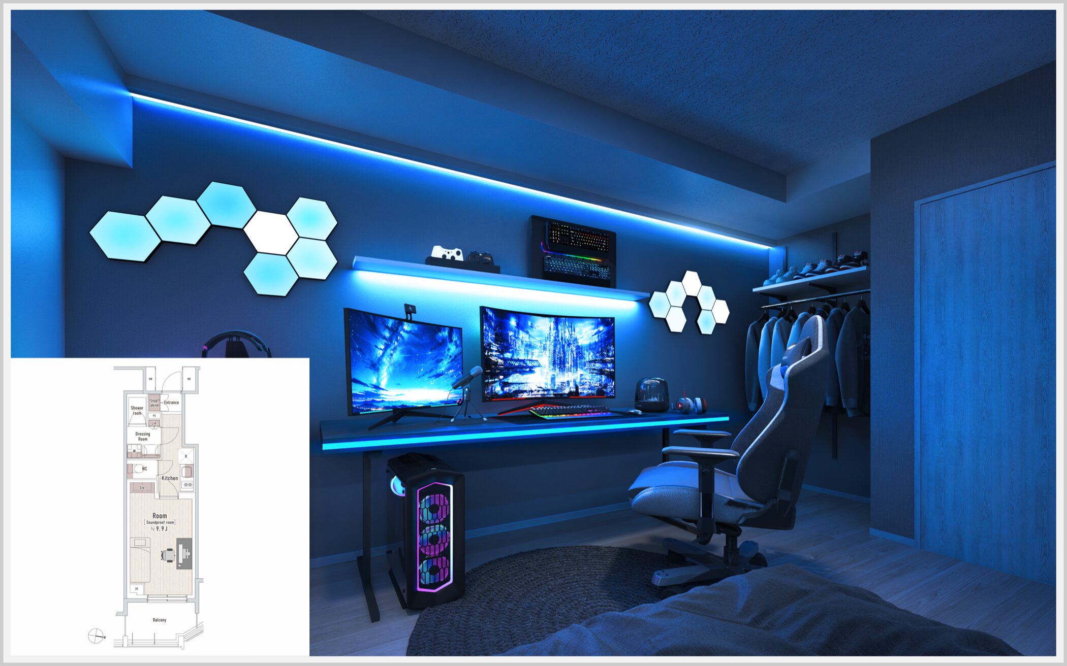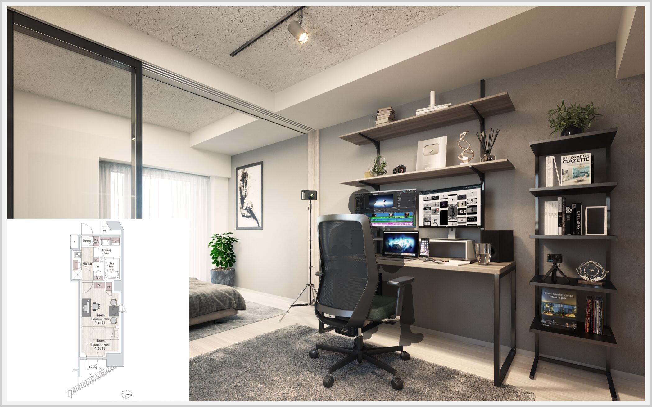 もう一方の部屋は、寝室としてのプライベート空間や、配信用やオンライン会議用のスペースにするなど、多様な使い方に柔軟に対応できるバランスの良いタイプです。