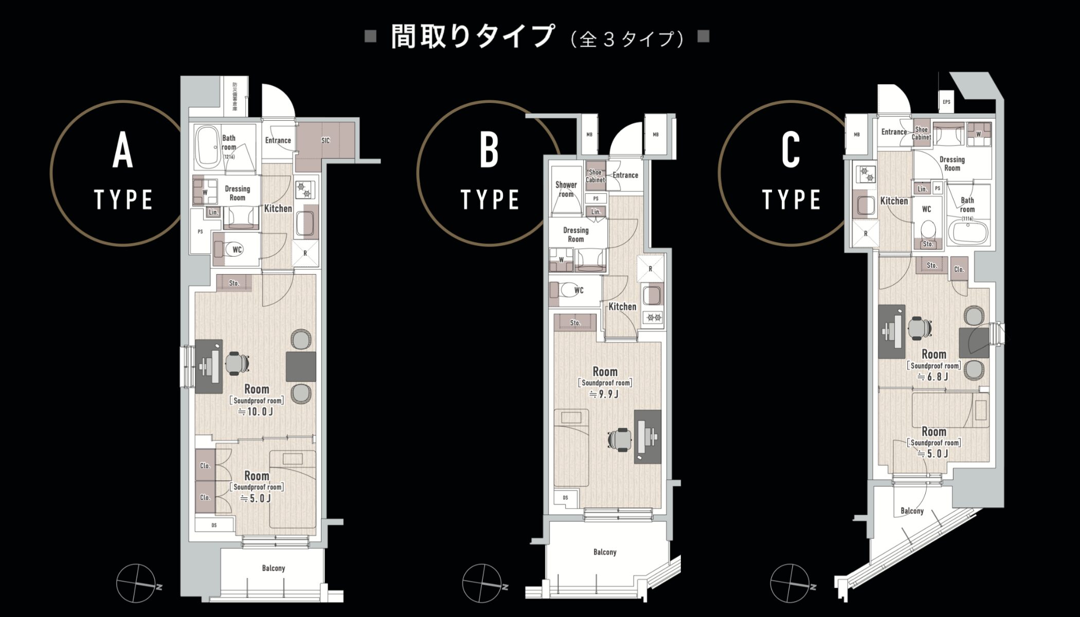TRACK渋谷本町では、クリエイターの多様なライフスタイルや制作スタイルに応えるため、特徴の異なる3つの間取りが用意されています。