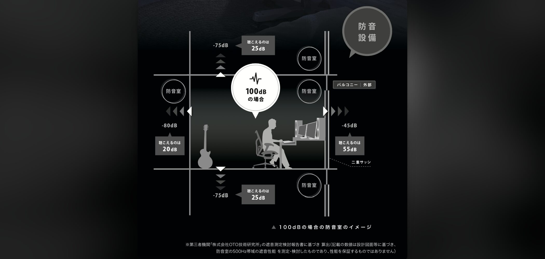例えば室内で100dBの音を出した場合でも、隣の部屋に届く音は20dB(木の葉のふれあう音程度)まで減衰される設計です。