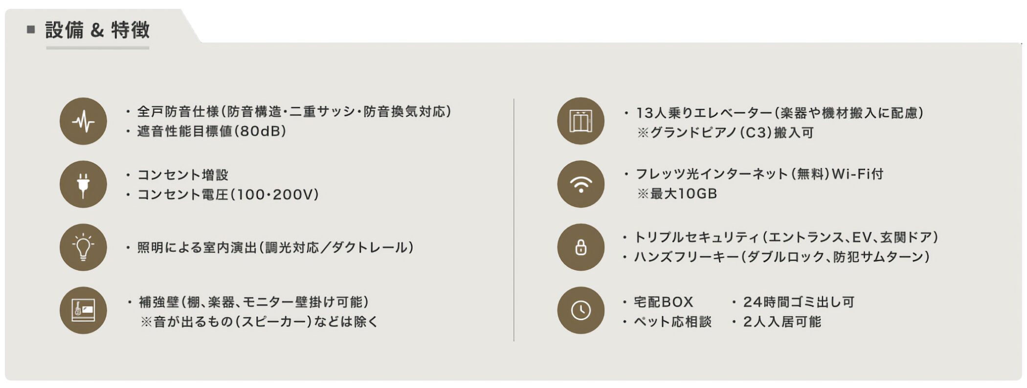 音楽制作に本格的に取り組むクリエイターのために、共用エレベーターはグランドピアノ(C3)の搬入が可能な13人乗りの大型サイズを採用しており、大型の機材も安心して持ち込めます。