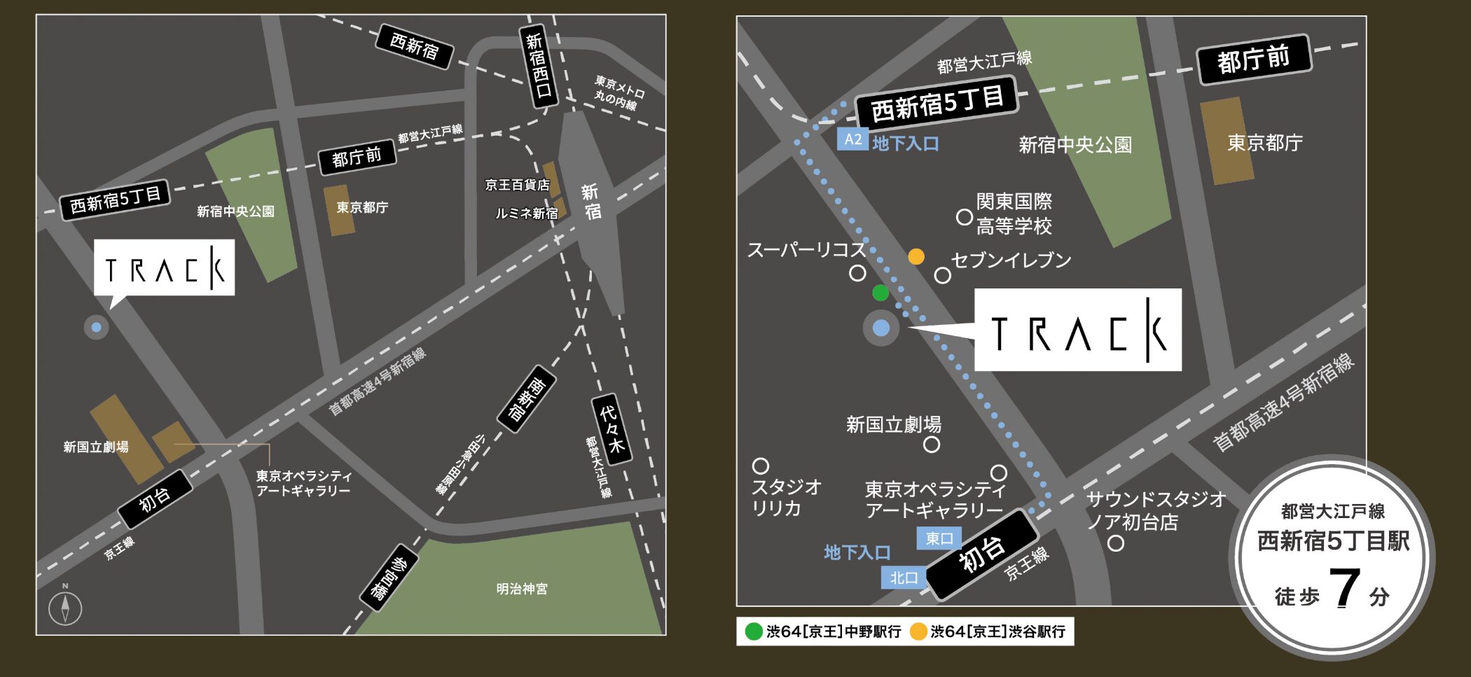 TRACK渋谷本町は、都営大江戸線「西新宿五丁目駅」から徒歩7分、京王線「初台」駅からは徒歩9分の場所に位置しています。