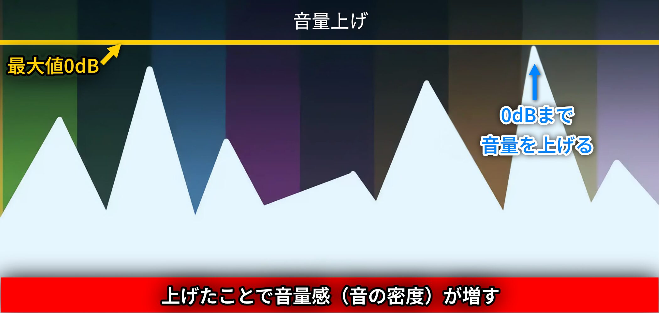 どちらも音が割れる「0dB」限界まで波形を上げたものですが、後者の方が大きく聴こえたはずです。