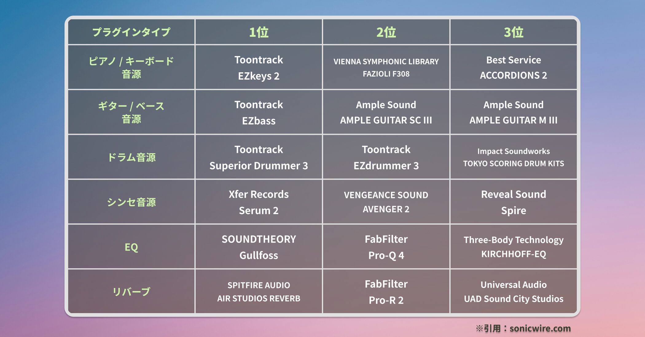 あと、楽器系は1位が全部Toontrackで、特にピアノとベースはAIや作曲支援系だから、時短できる音源の需要が高いって感じかな。