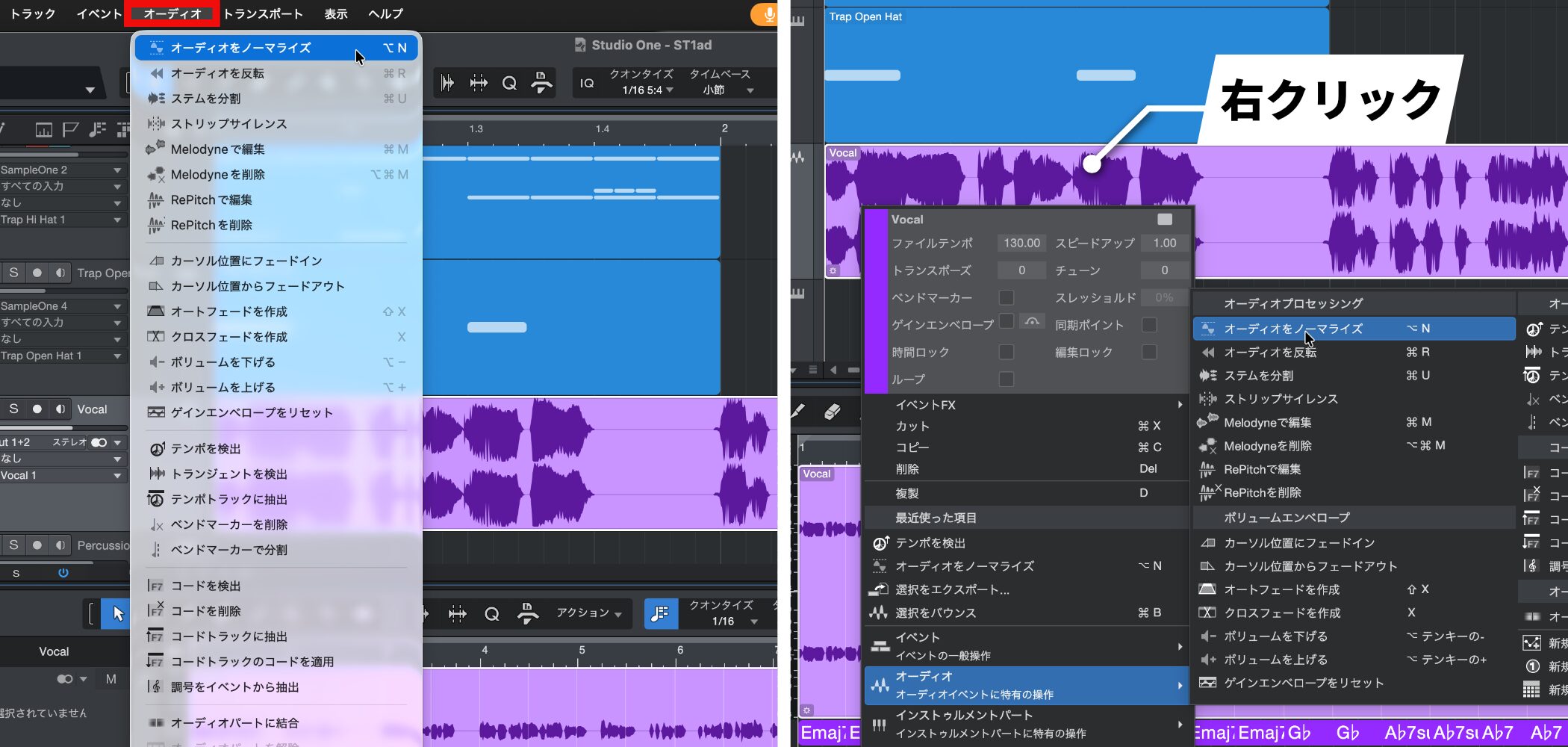 または、選択したイベントを右クリックし、表示されるメニューから「オーディオ オーディオイベントに特有の操作」→「オーディオをノーマライズ」を選択することもできます。