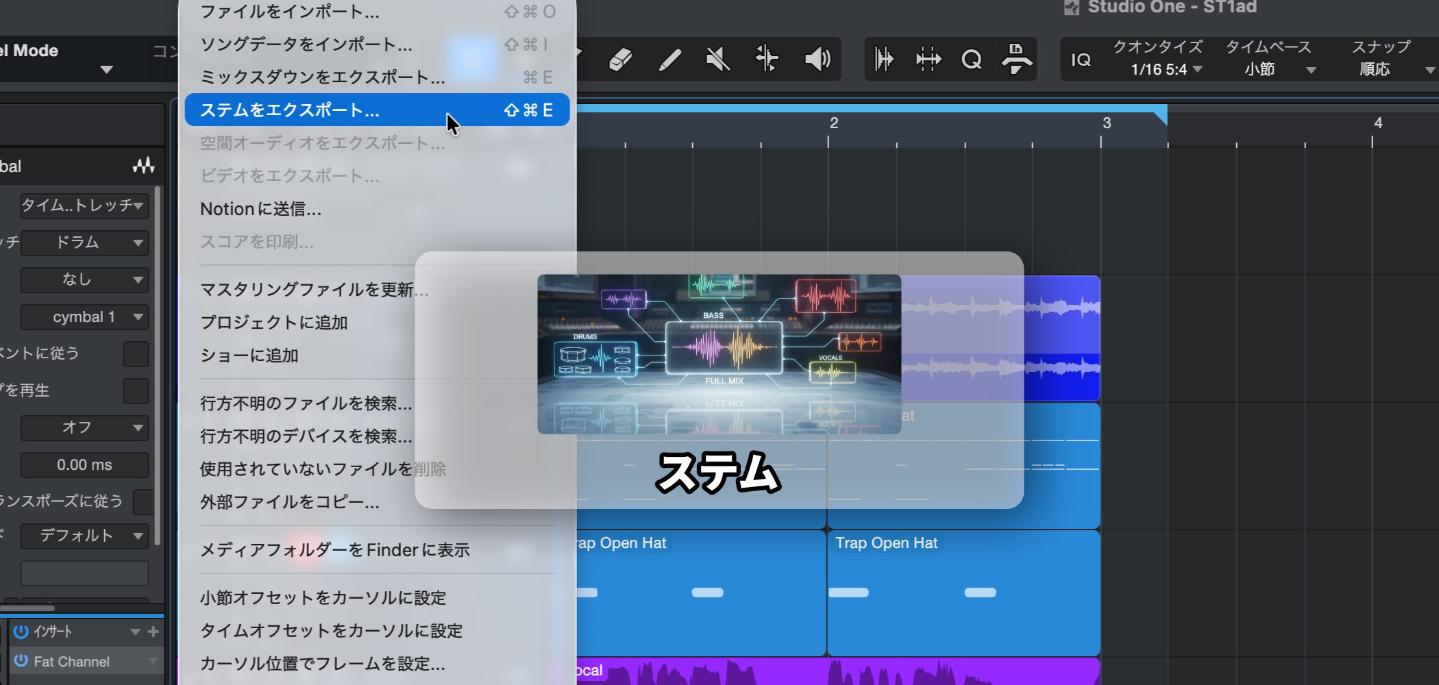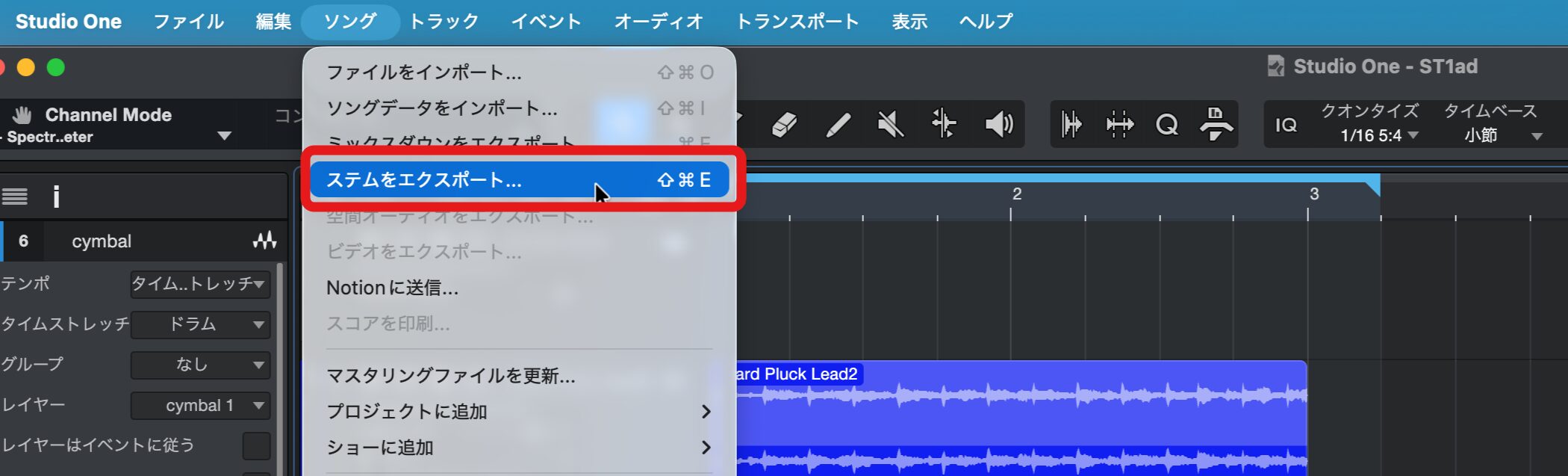 上部メニューから「ソング」→「ステムをエクスポート」を選択します。