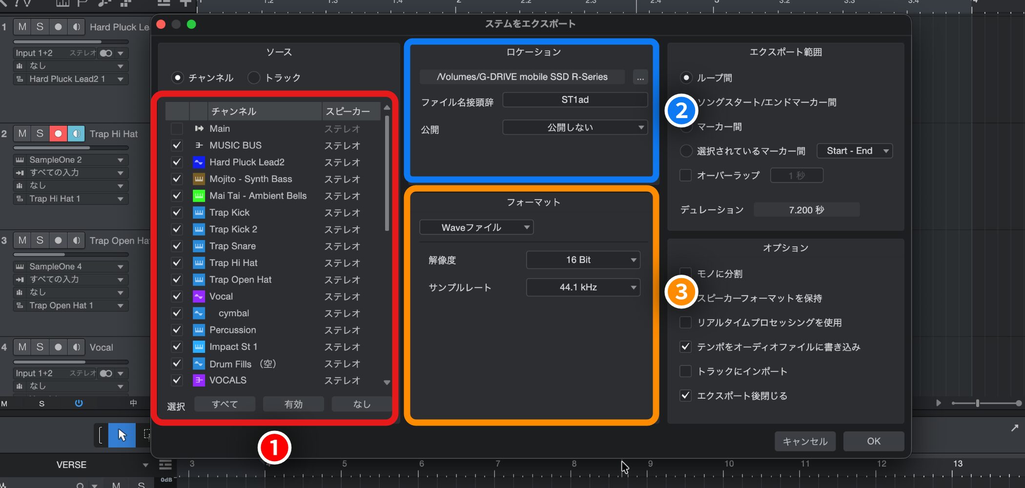 ②(青):書き出すトラックの場所を選択します。必要がない場合は空欄で進めます。