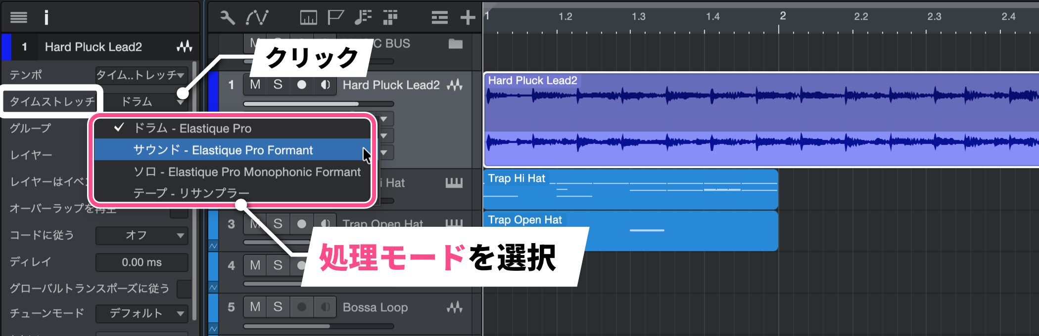 タイムストレッチ機能を使用する際、どのようなオーディオ素材を扱うかに応じて、最適な処理モードを選択することができます。