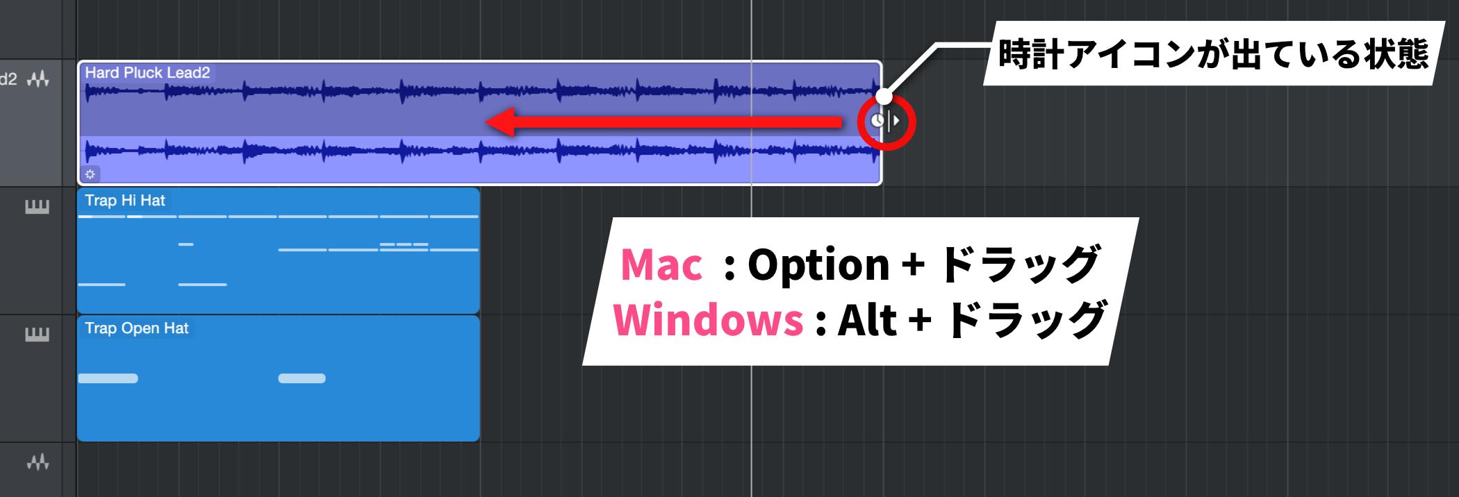 次に、イベントの長さを目的の小節に合わせるため、イベントの端にカーソルを合わせ、以下のキーを押しながらドラッグします。