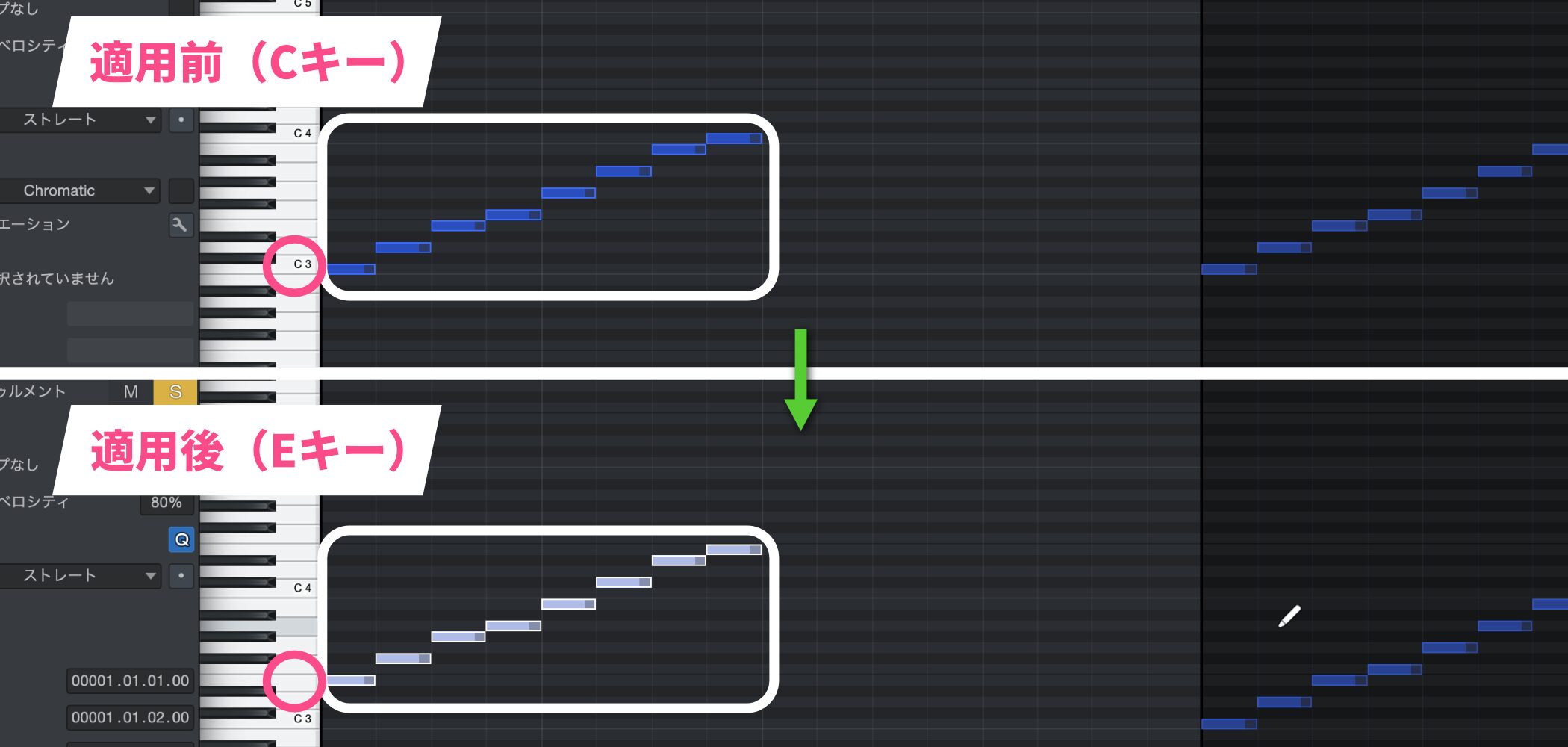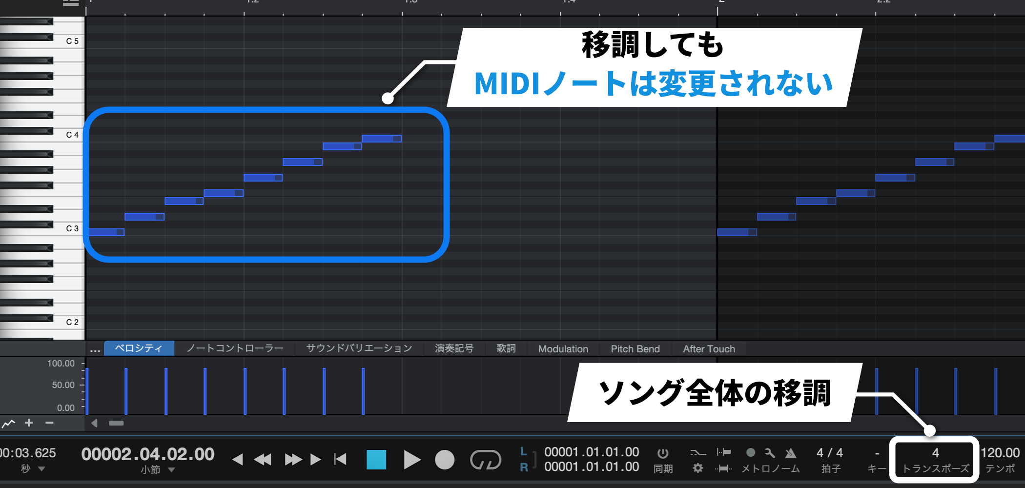 MIDIノートは移動せず再生音のみを移調するため、ボーカリストのキーに合わせる際など、元のデータを保持しながら全体のキーを調整したい場合に便利です。