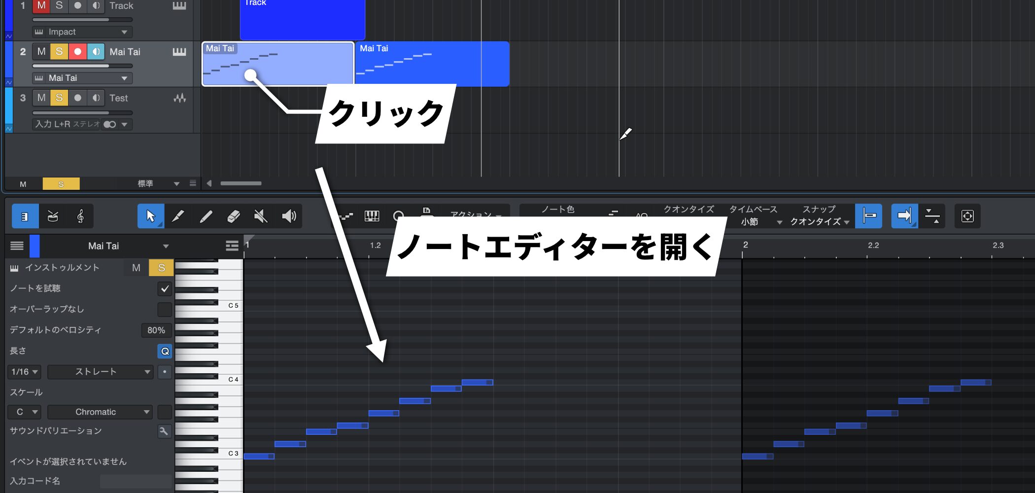 移調したいMIDIイベントをクリックし、ノートエディターを開きます。