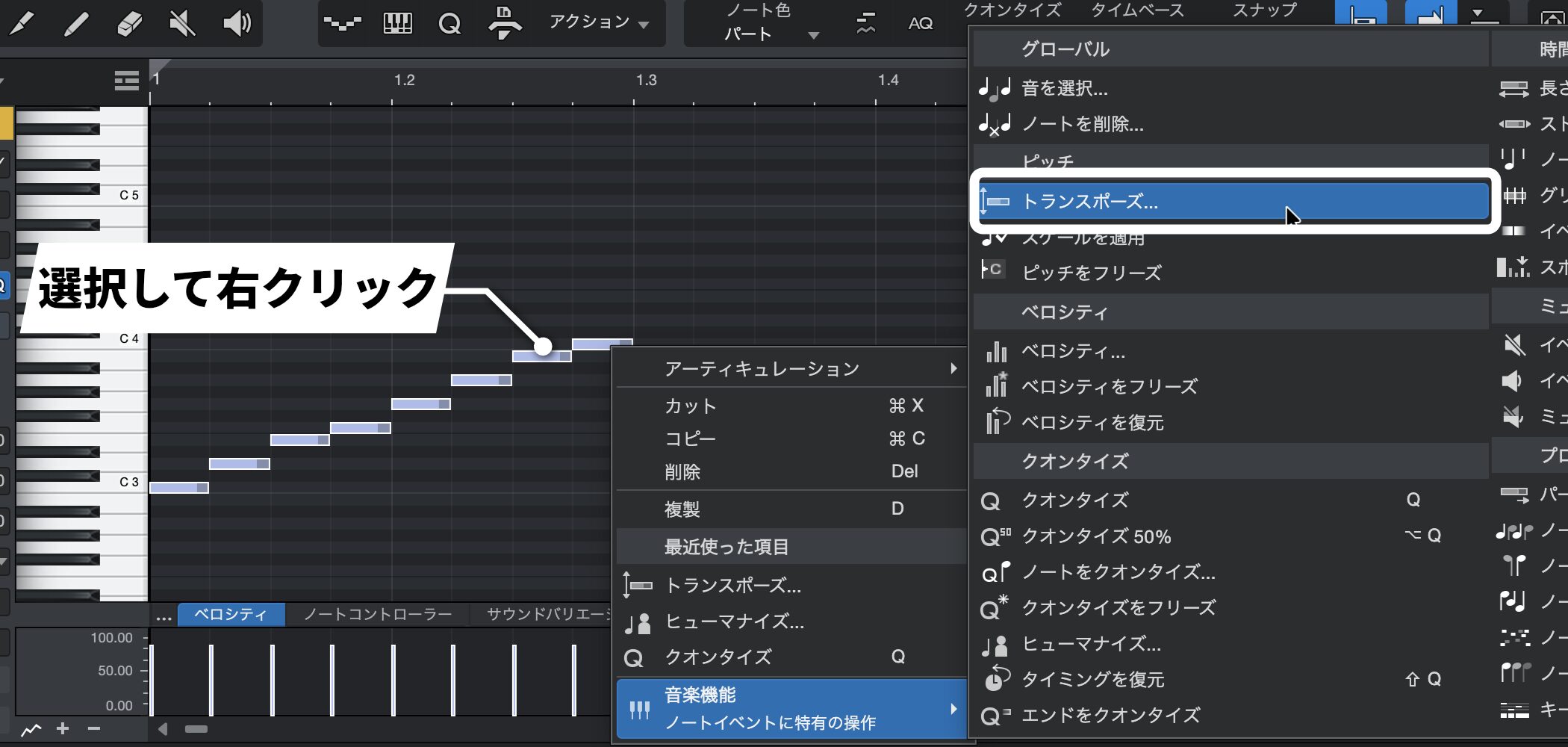 移調したいMIDIノートを選択し、右クリックメニューの「音楽機能」から「トランスポーズ…」を選択します。