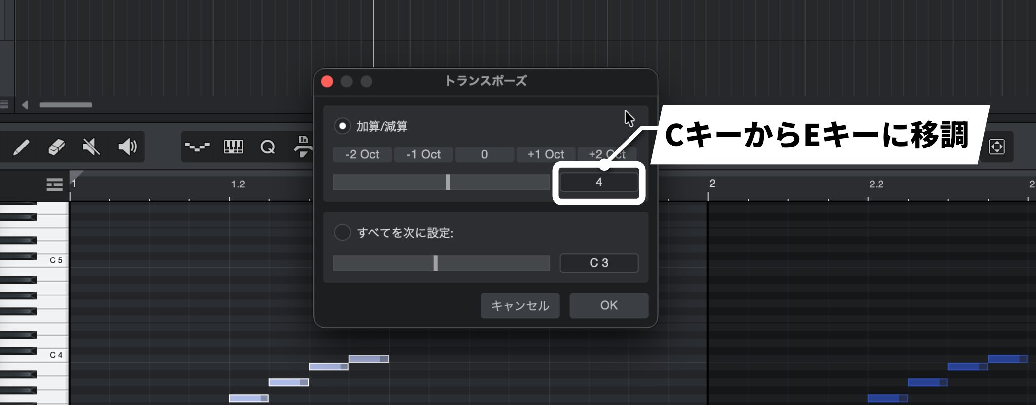 例えば、CキーからEキーに変更する場合、4半音上げるため「4」を入力して「OK」をクリックします。