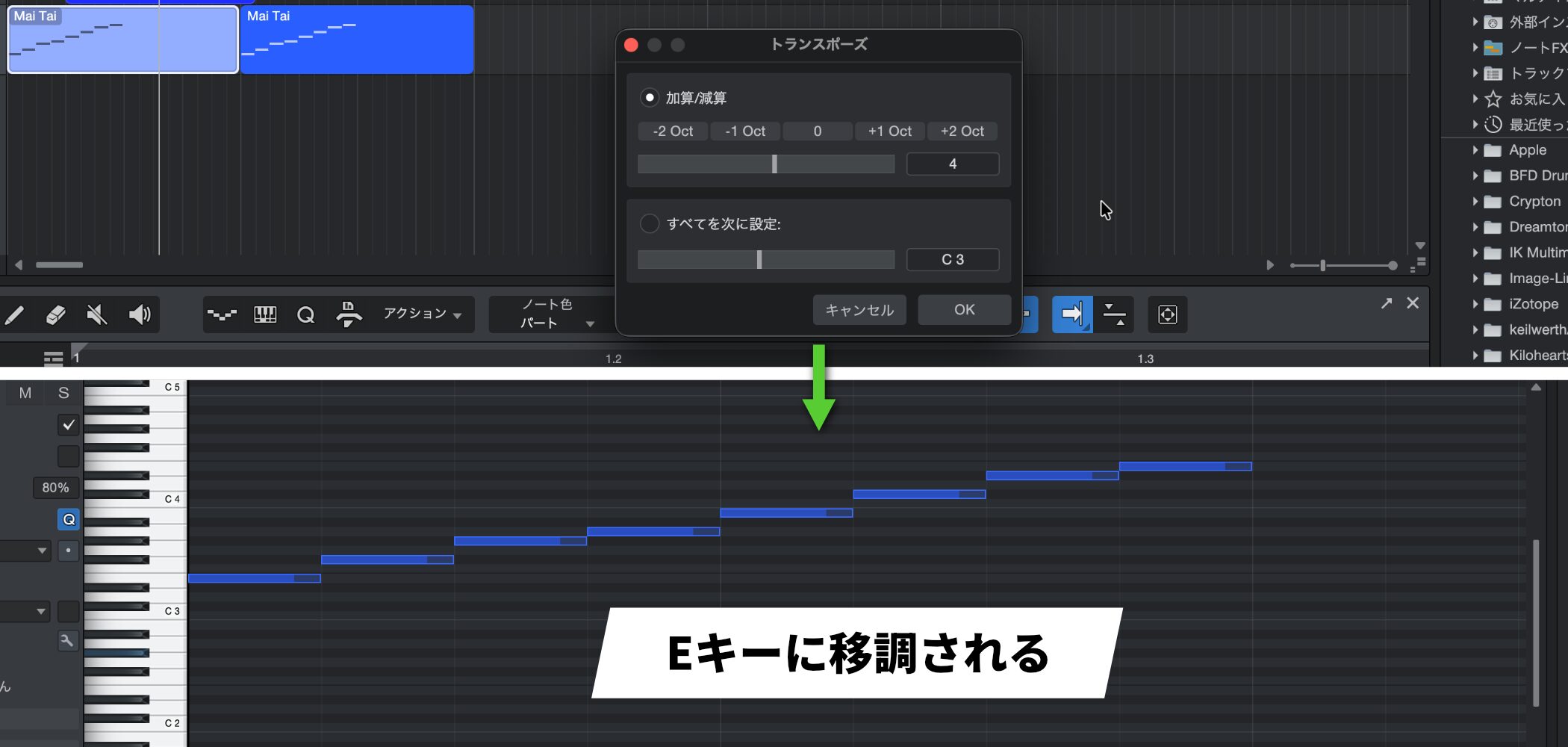 この機能は、「制作した楽曲がボーカリストのキーに合わない」場合や、「楽曲のイメージをガラッと変えたい」といった場合に特に活躍します。