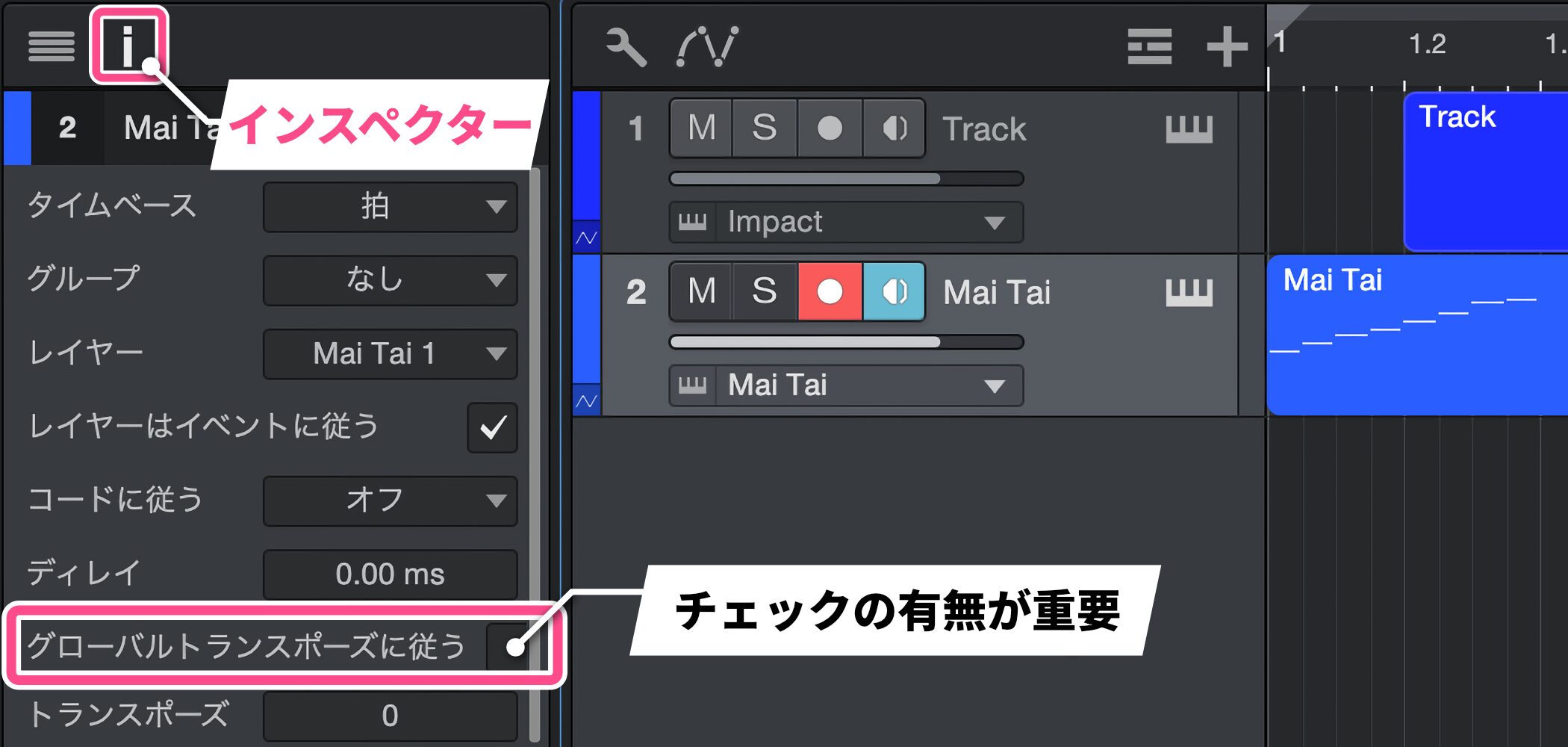 グローバル・トランスポーズ機能を使う際、MIDIトラック(インストゥルメント・トラック)のインスペクターにある「グローバル・トランスポーズに従う」のチェックボックスの設定が重要になります。