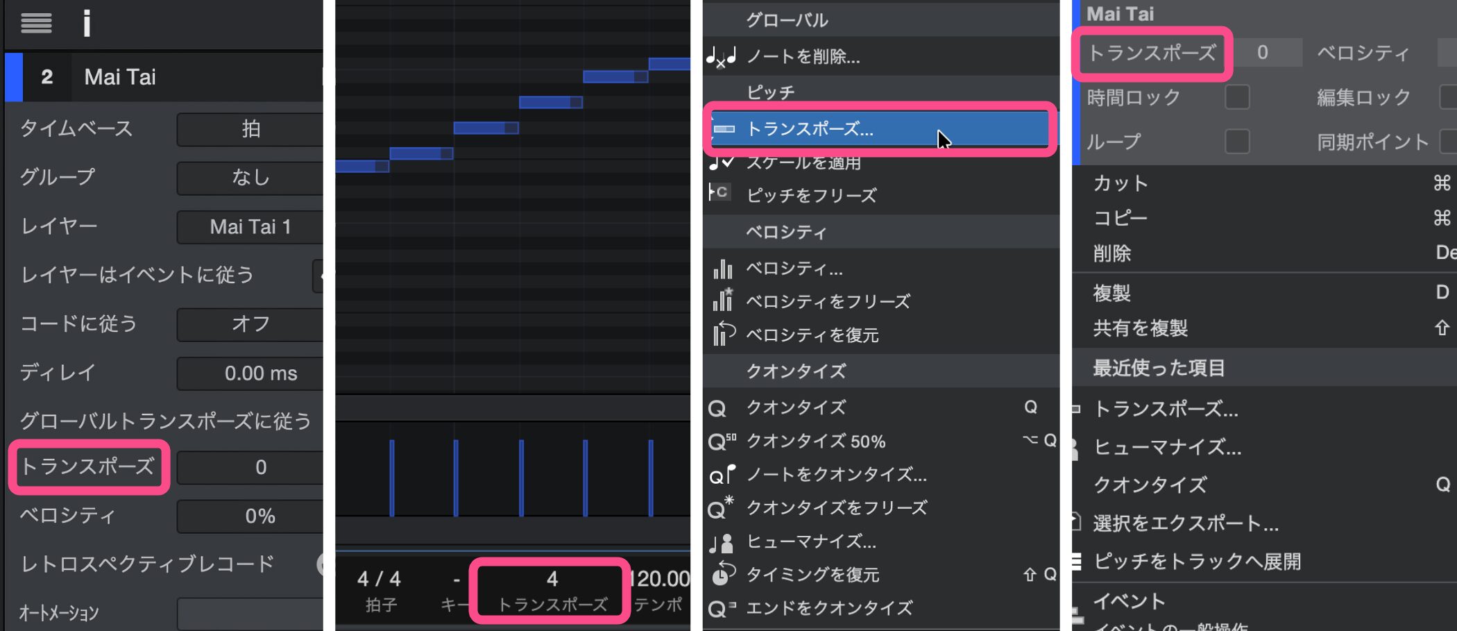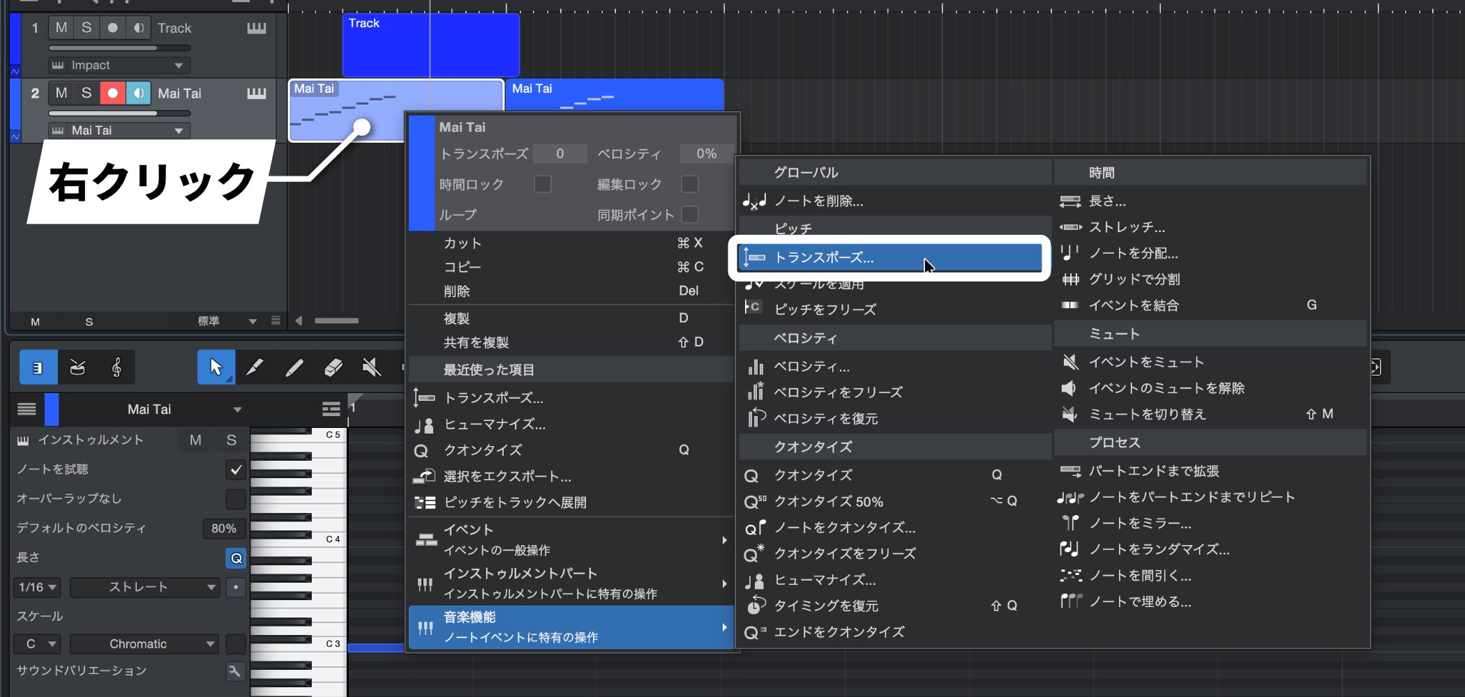手動で全トラックを移調することも可能ですが、トランスポーズ機能を利用すれば、より簡単に移調を行えます。