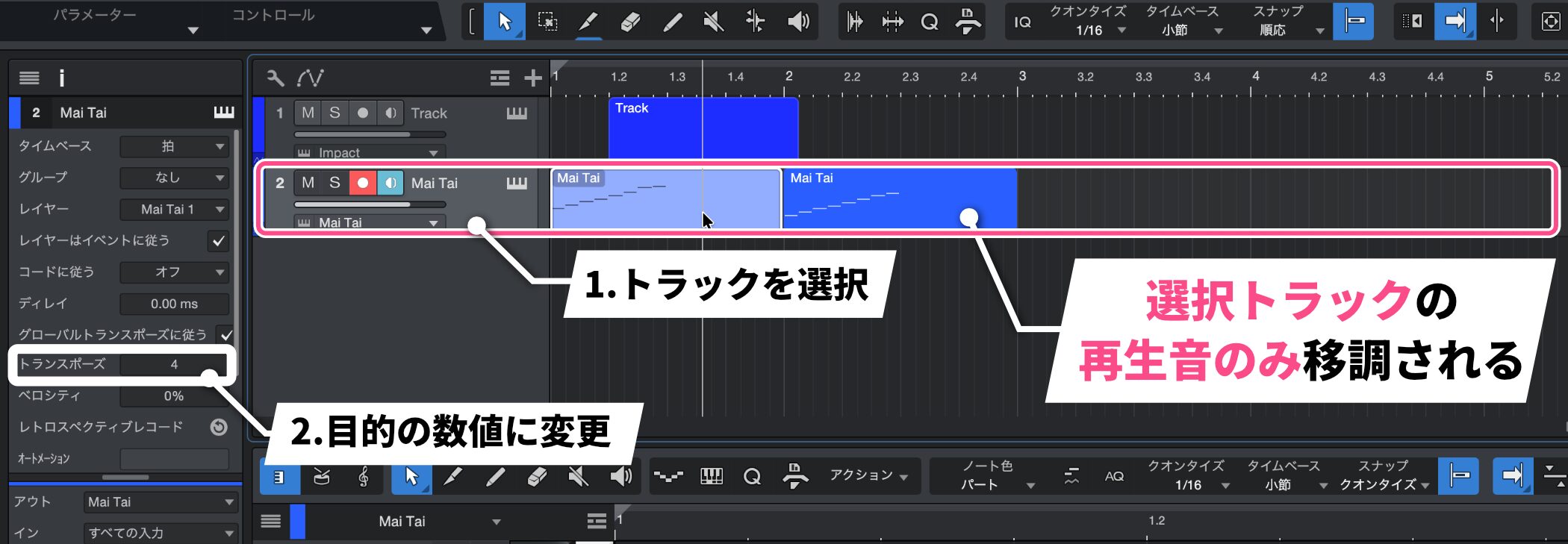 変更後は、選択トラック全体の再生音のみが移調されます。