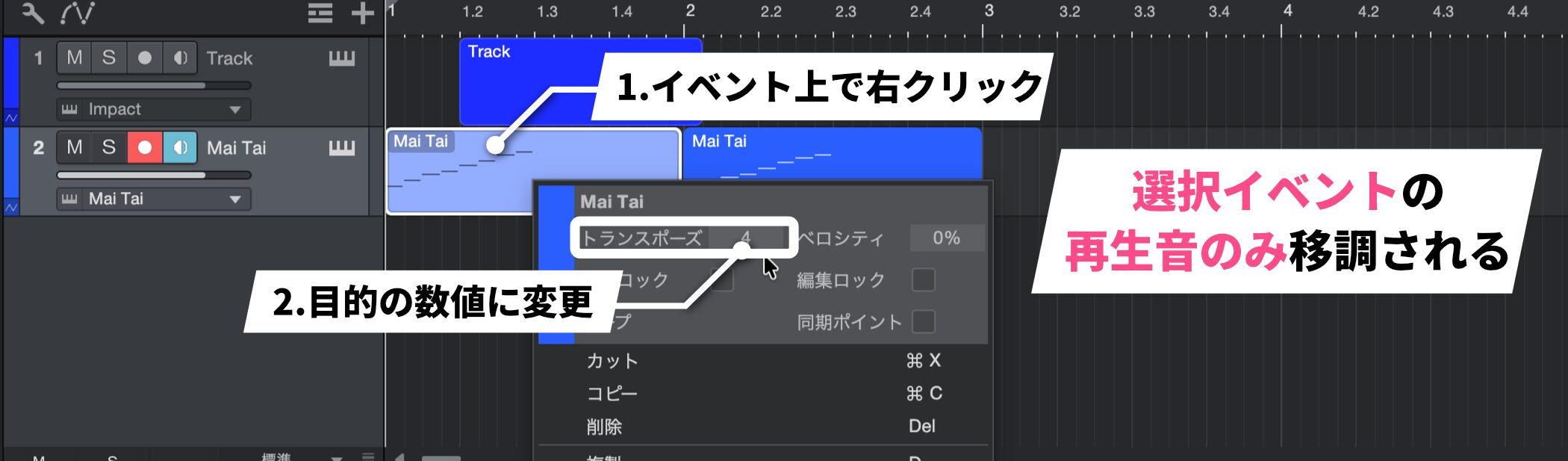 対象のイベント上で右クリックし、トランスポーズ値を変更します。