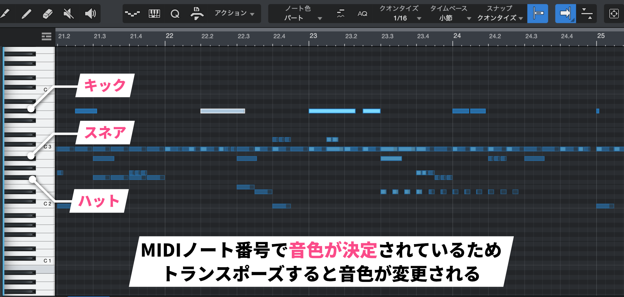ドラムトラック(キック、スネア、ハットなど)は、MIDIノート番号によって音色が決定しています。