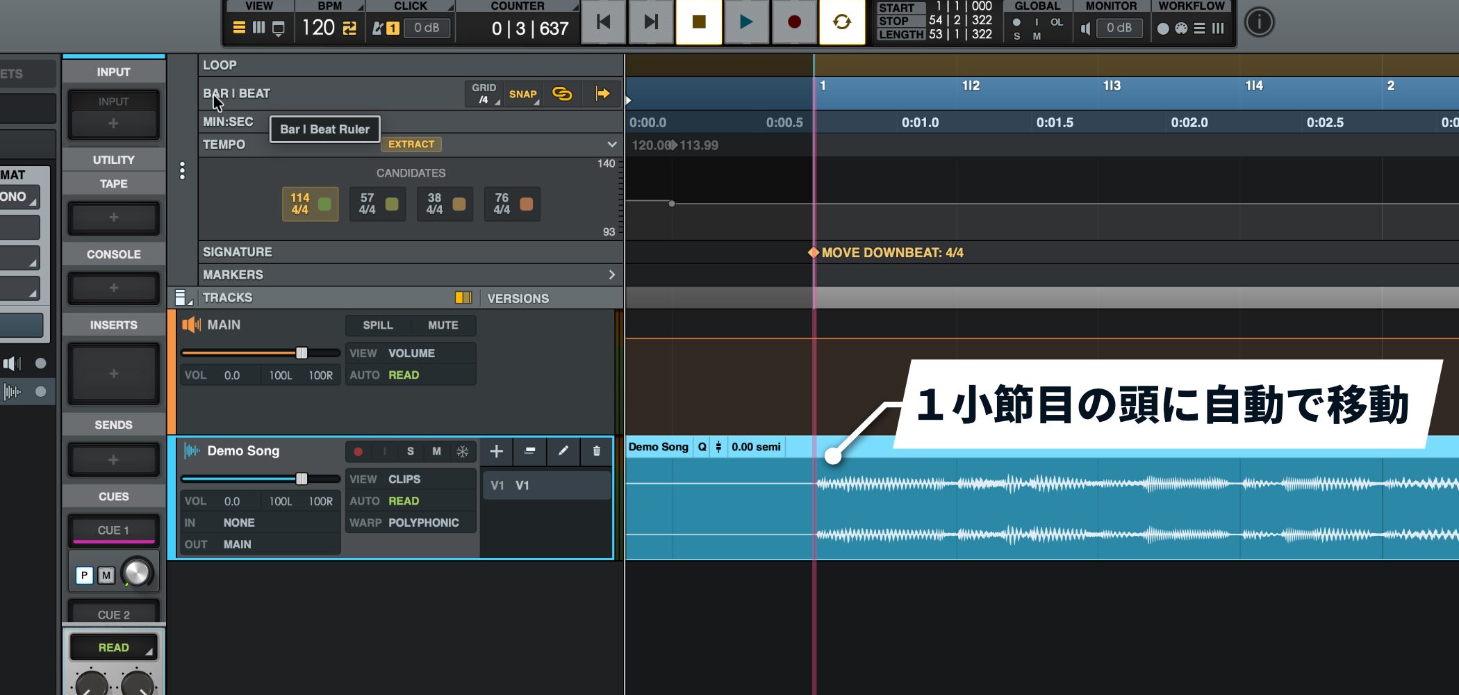 この「頭出し」の作業を手動で行うと時間がかかりますが、LUNA 2.0なら楽曲の開始位置を小節の頭(グリッド)に自動で合わせるため、すぐに録音を始められます。