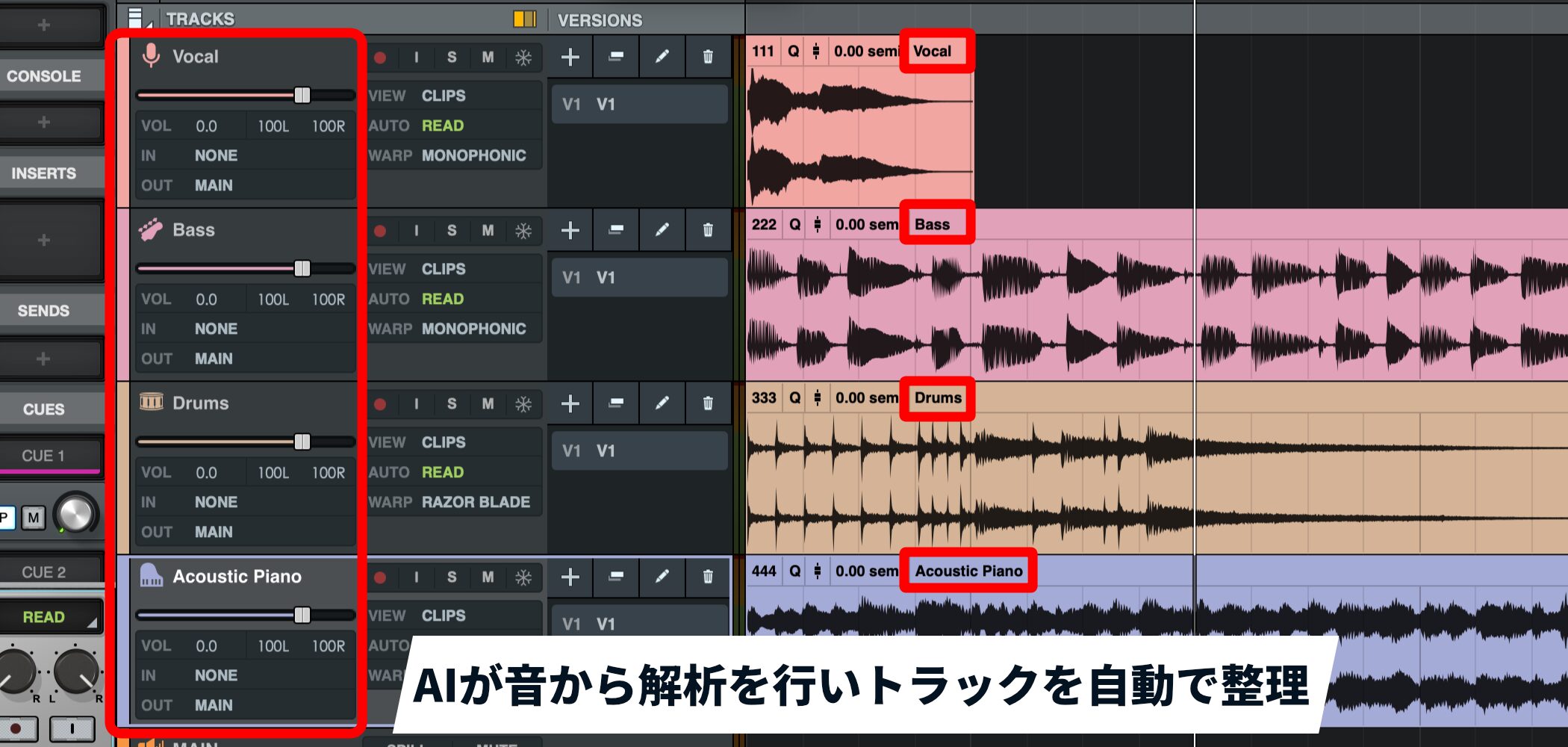 そんなトラック整理もLUNA 2.0では、AIが音源を解析して自動で行ってくれます。