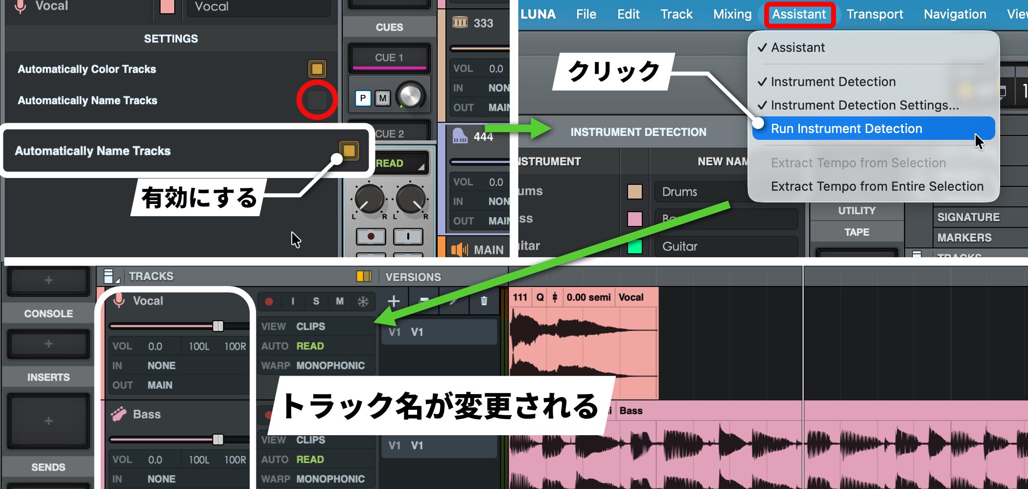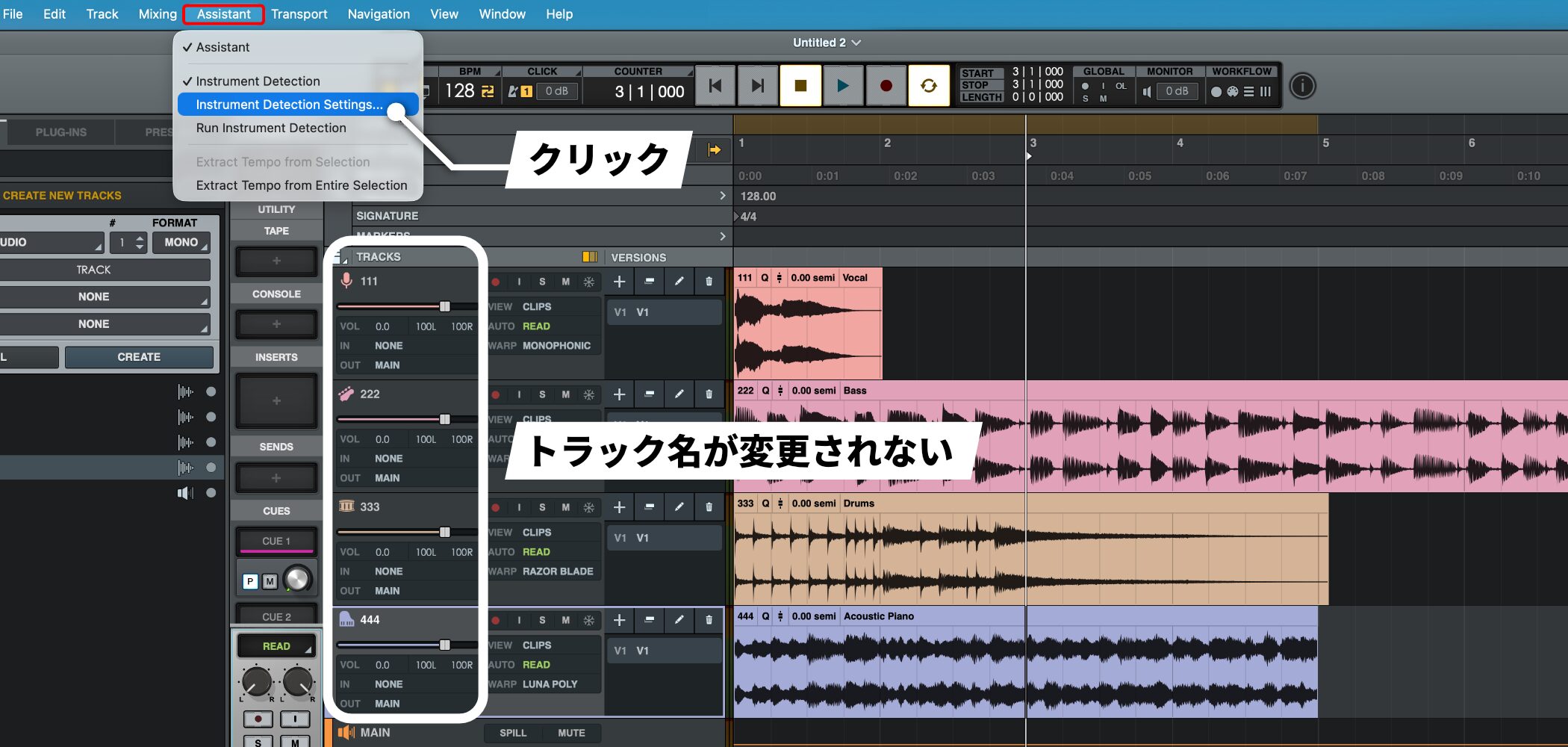 また、トラック名が変更されない場合は、上部メニュー「Assistant」→「Instrument Detection Settings…」を選択します。