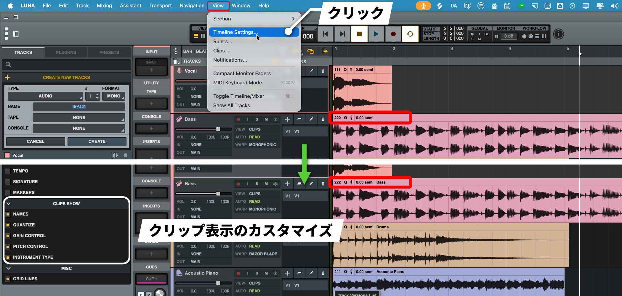 ちなみに、クリップの表示内容は、上部メニュー「View」→「Timeline Settings…」を選択し、「CLIPS SHOW」セクションで、有効/無効をカスタマイズできます。