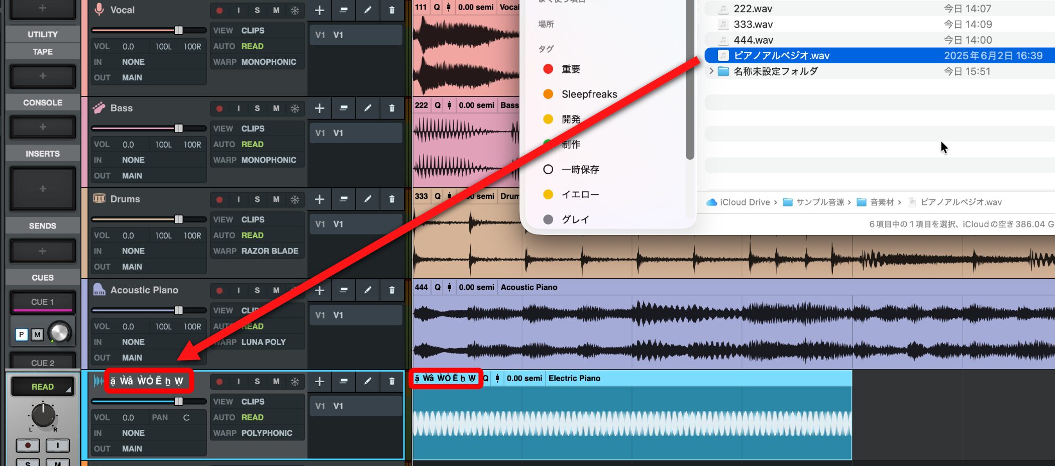 なお、オーディオファイルを取り込む際の注意点として、LUNA 2.0は英語のソフトウェアであるため、日本語のファイル名を使用すると文字化けが発生する可能性があります。