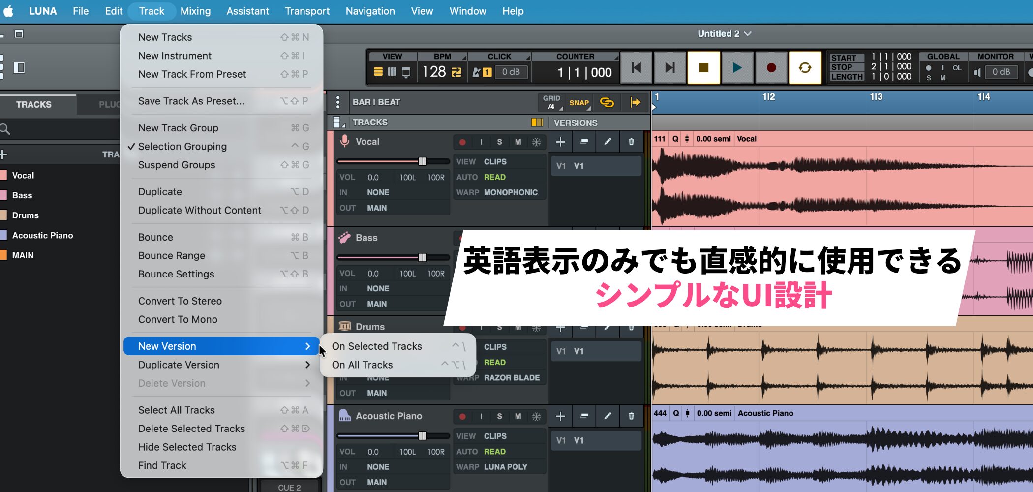 LUNA 2.0は現在、日本語にローカライズされていませんが、比較的新しいDAWならではのシンプルなUI設計が特徴です。