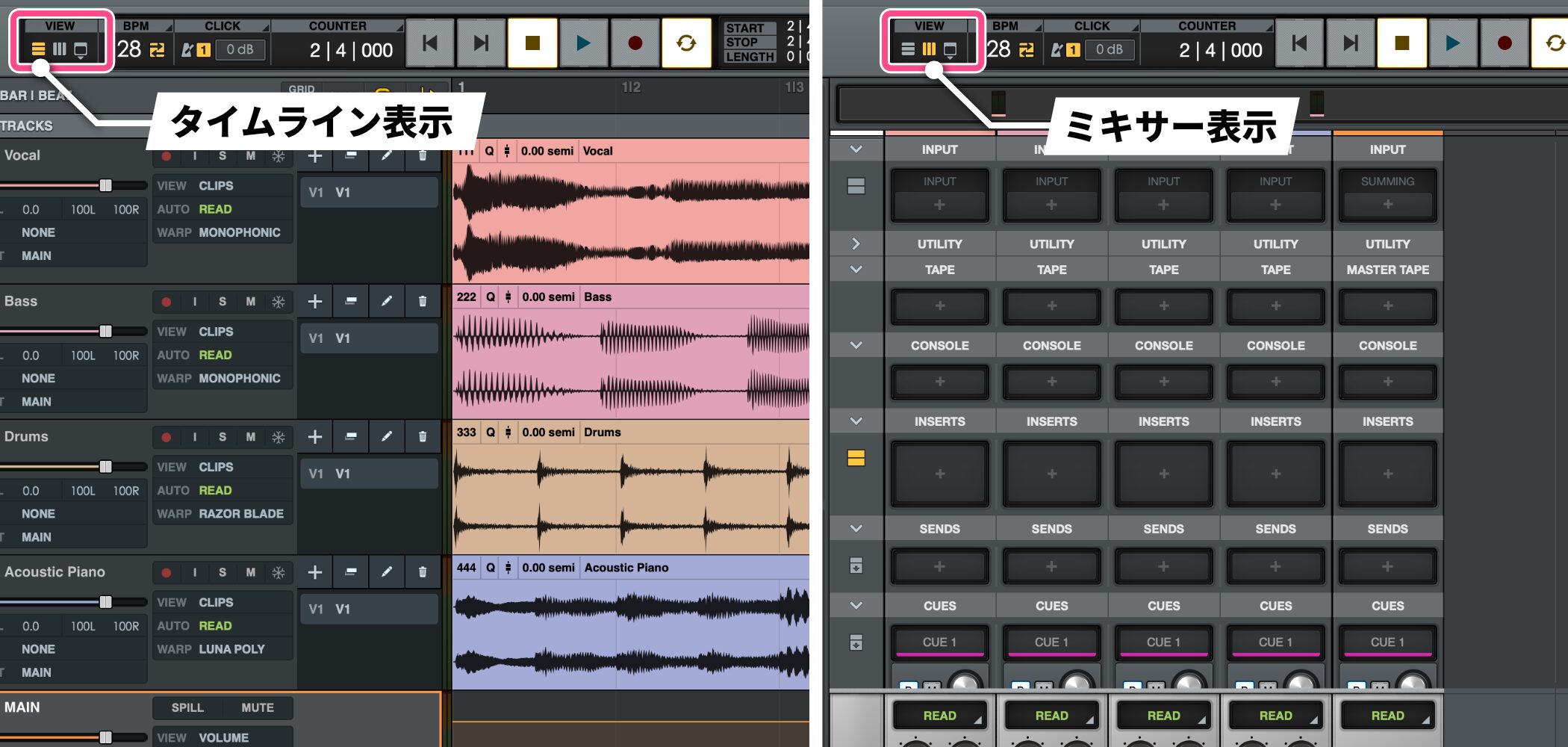 基本的にはタイムライン表示とミキサー表示を切り替えるだけで、ほとんどの作業を完結できる設計です。