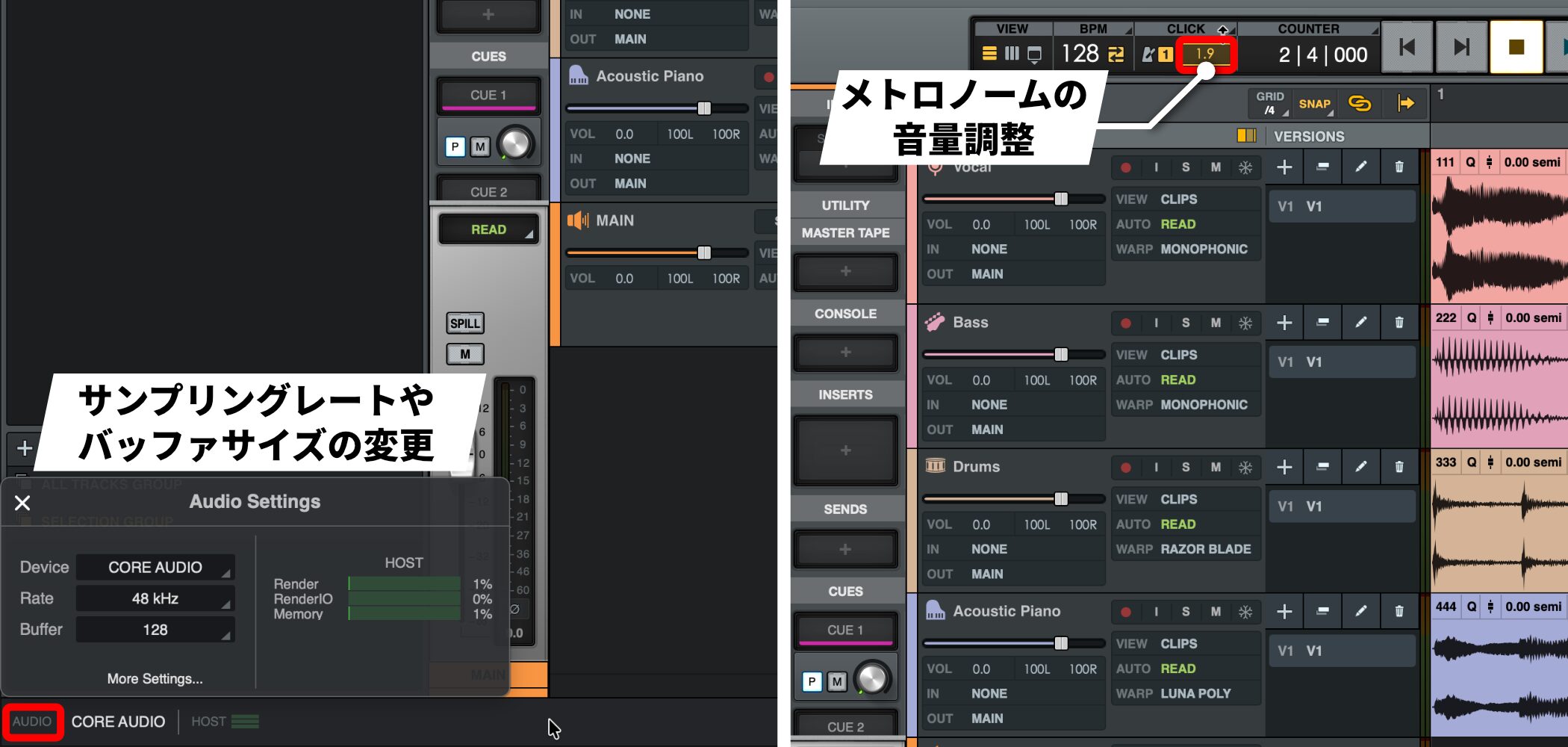 例えば、画面下部の「Audio」セクションからはサンプリングレートやバッファサイズを即座に変更でき、メトロノームの音量調整も専用ウィンドウを開かずに行えます。