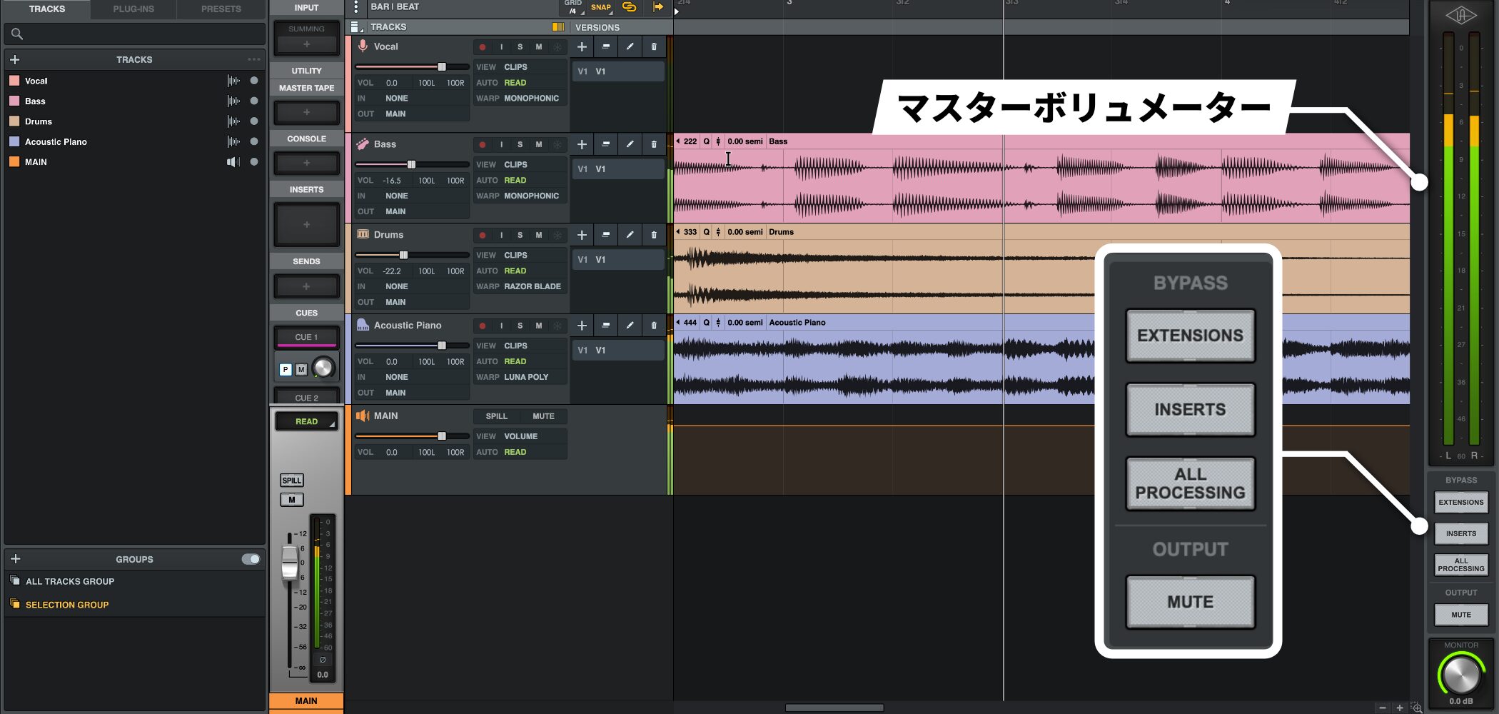 インサートエフェクトの一斉バイパスボタンなどもワンクリックでアクセスできる仕様になっています。