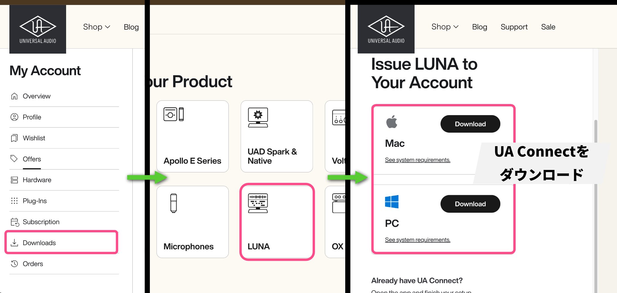 「Downloads」→「LUNA」と進み、管理ソフトウェア「UA Connect」をダウンロードしてインストールします。
