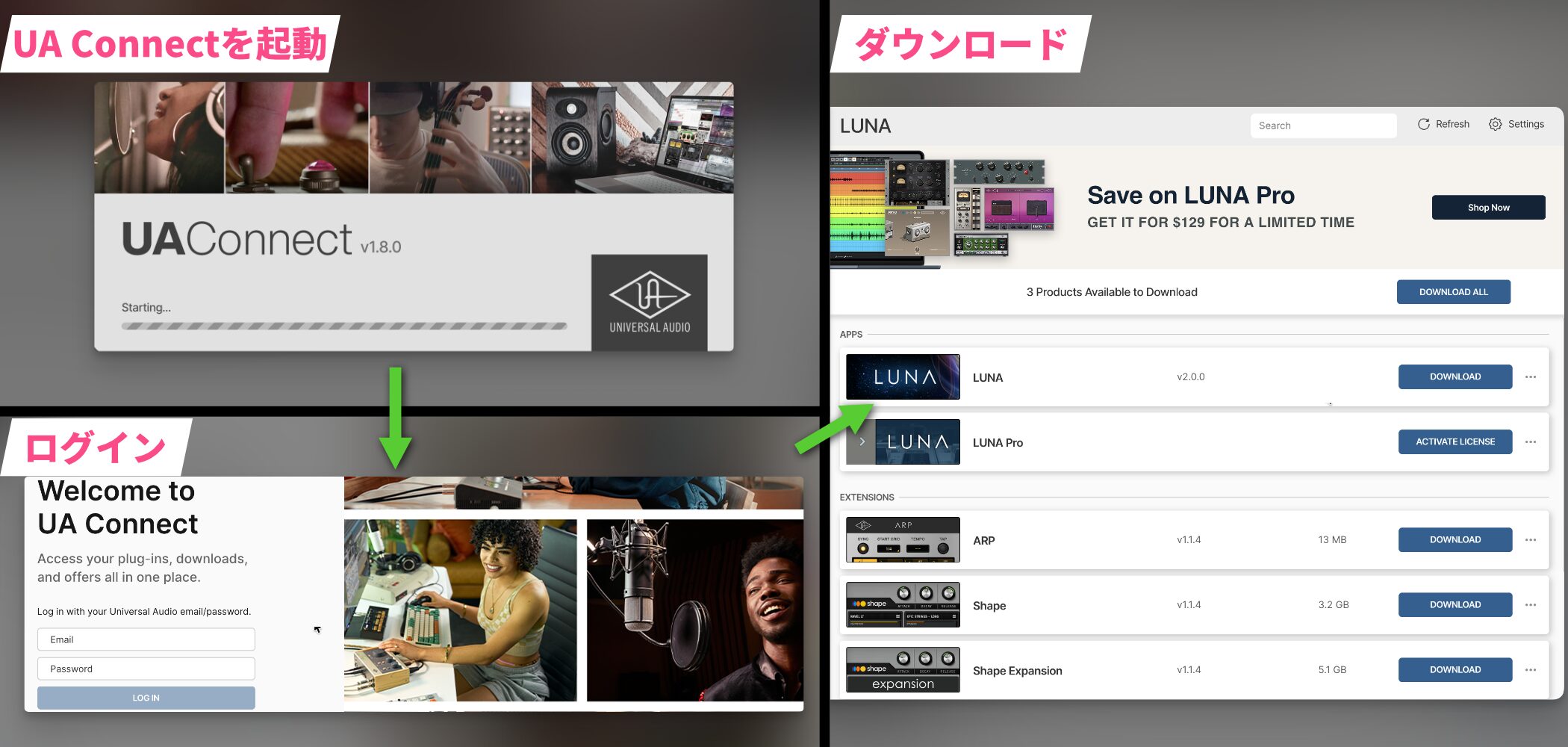 「UA Connect」を起動し、作成したアカウントでログインすると、LUNA 2.0本体のダウンロードとライセンス認証が可能になります。