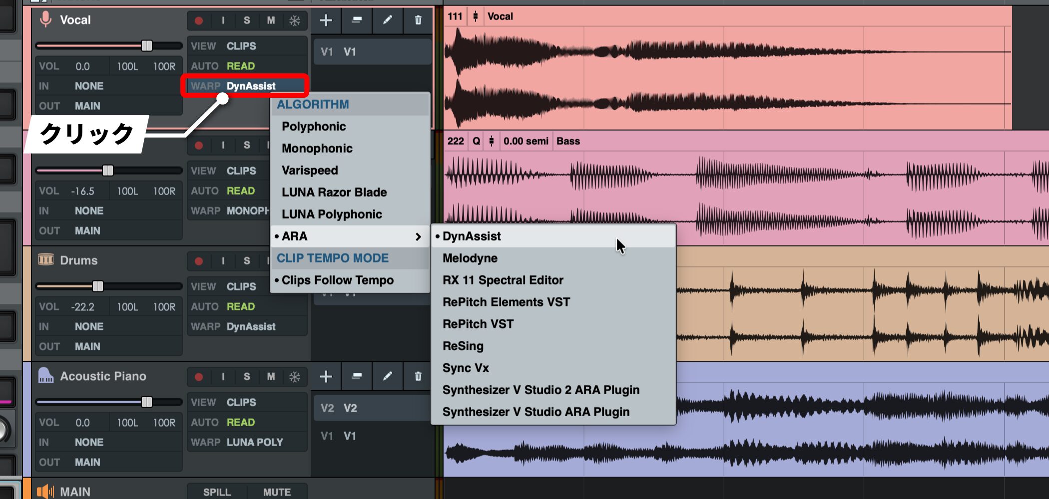 ARA対応プラグインは、トラックの「WARP」→「ARA」から起動できます。