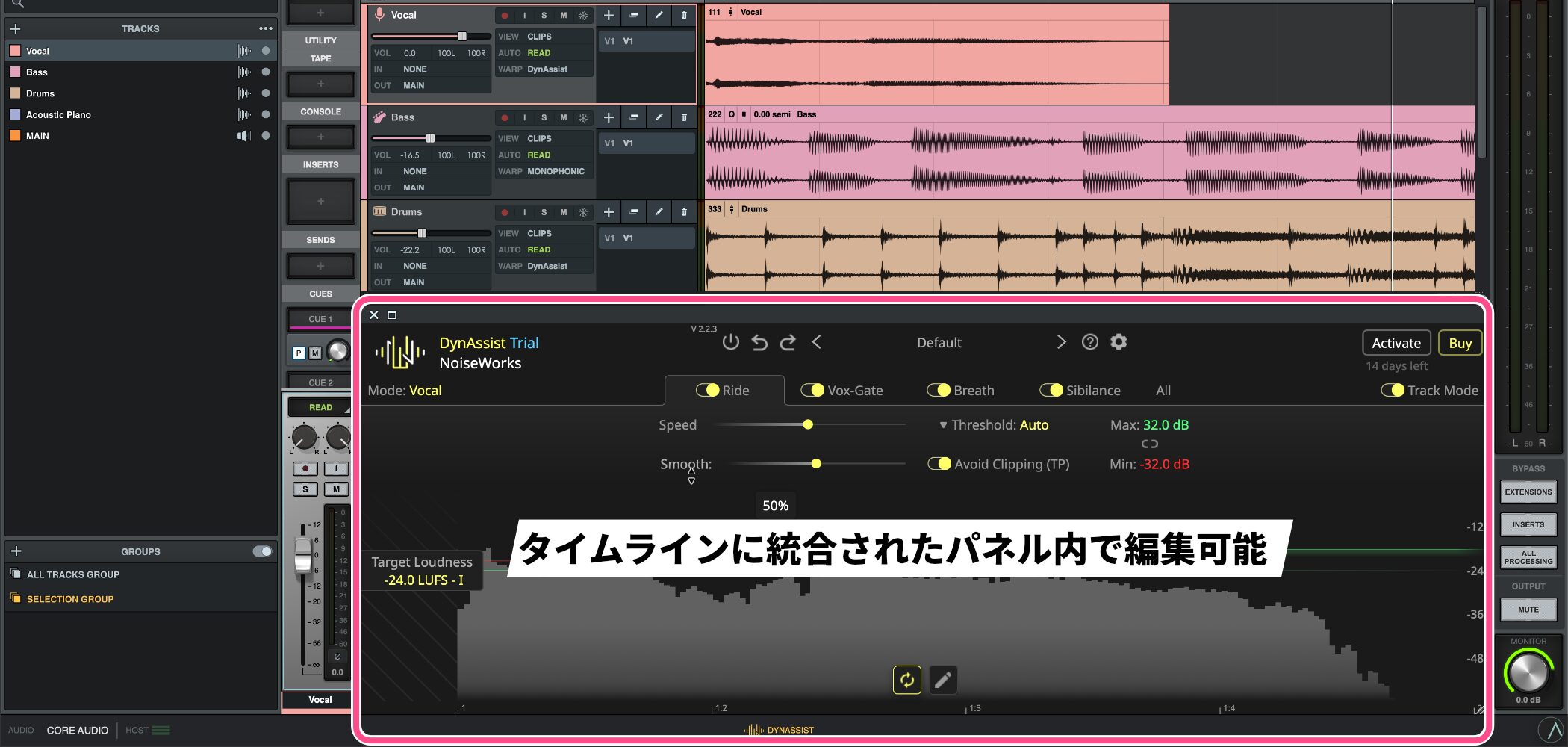 ボーカルのピッチ補正から音量の均一化まで、作業の流れを止めずに処理できるため、特にボーカルミックスの効率が大幅に向上します。