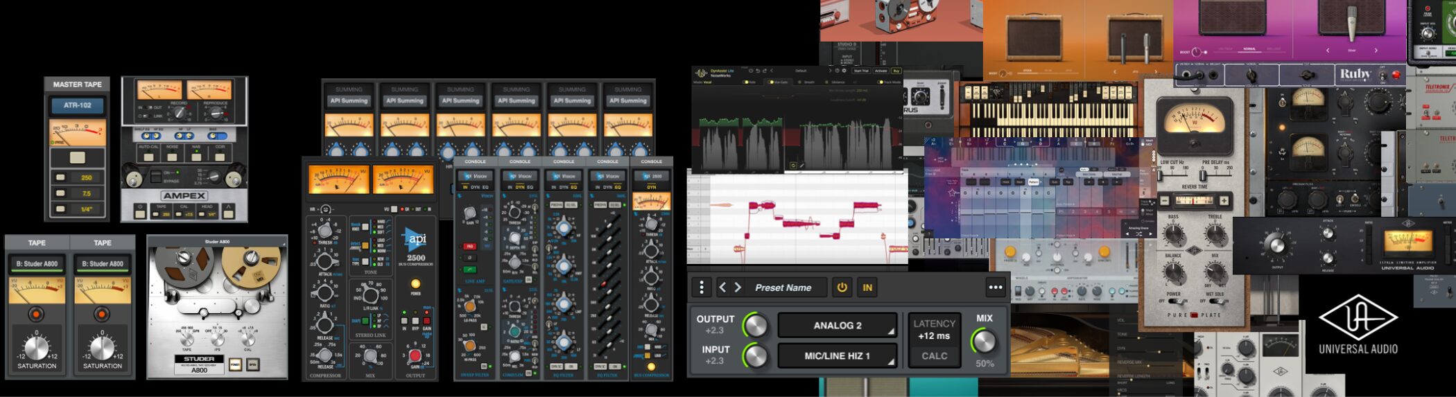 ラインナップには、下記のようなレコーディングスタジオで定番の名機エミュレーションから、UAの最高峰バーチャルインストゥルメントまで揃っています。
