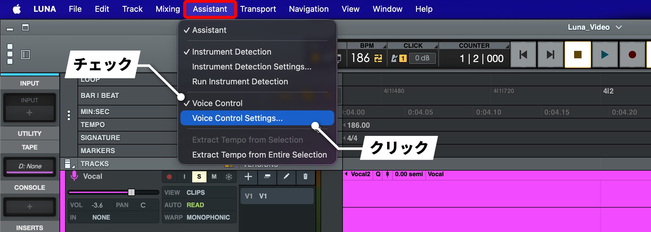 使用するには、上部メニューで「Assistant」を開き、「Voice Control」にチェックが入った状態で「Voice Control Settings…」を選択します。