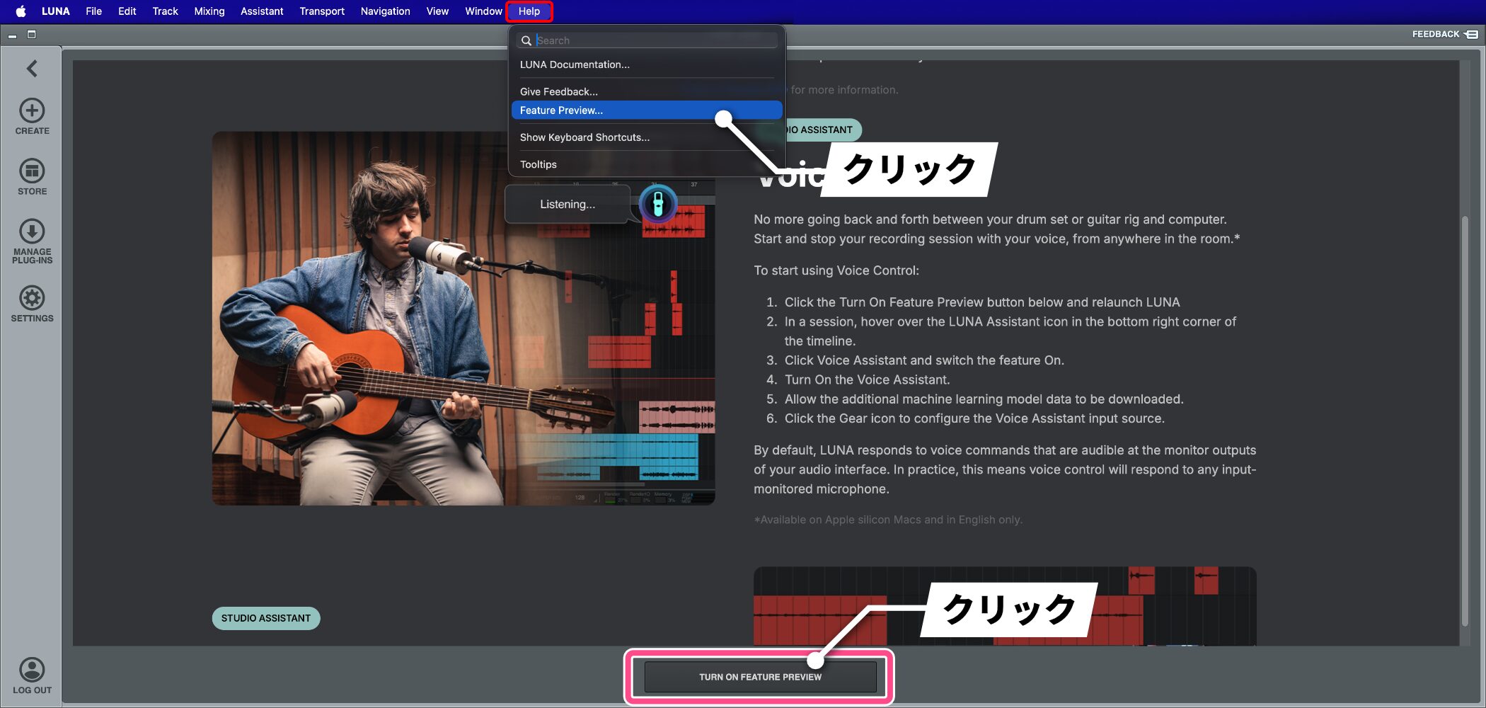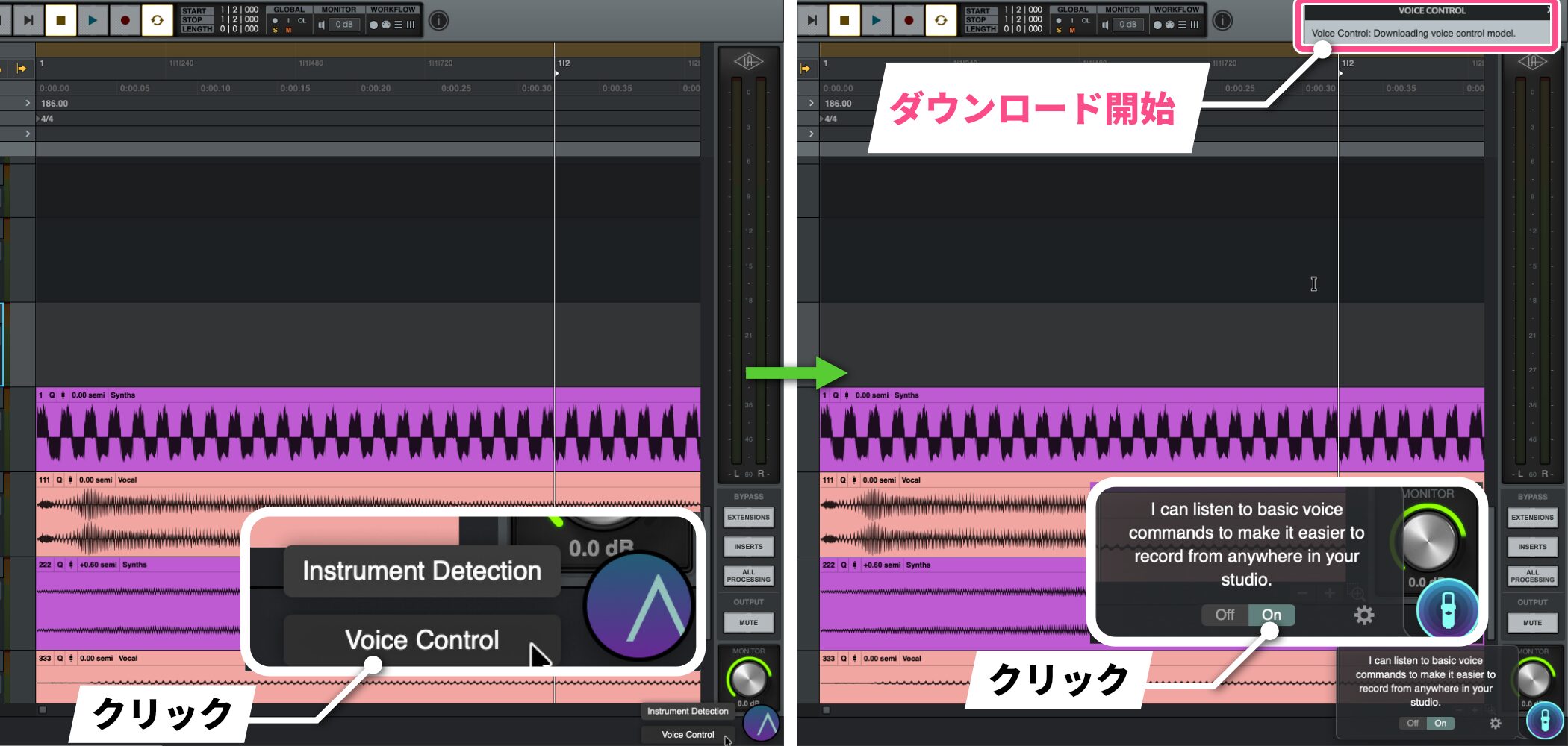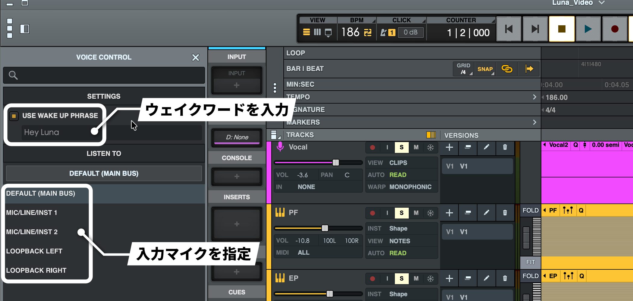 LUNA 2.0には、「Hey Siri」や「アレクサ」のように、DAWを音声で操作できる「ボイスコントロール」というユニークな機能も搭載されています。