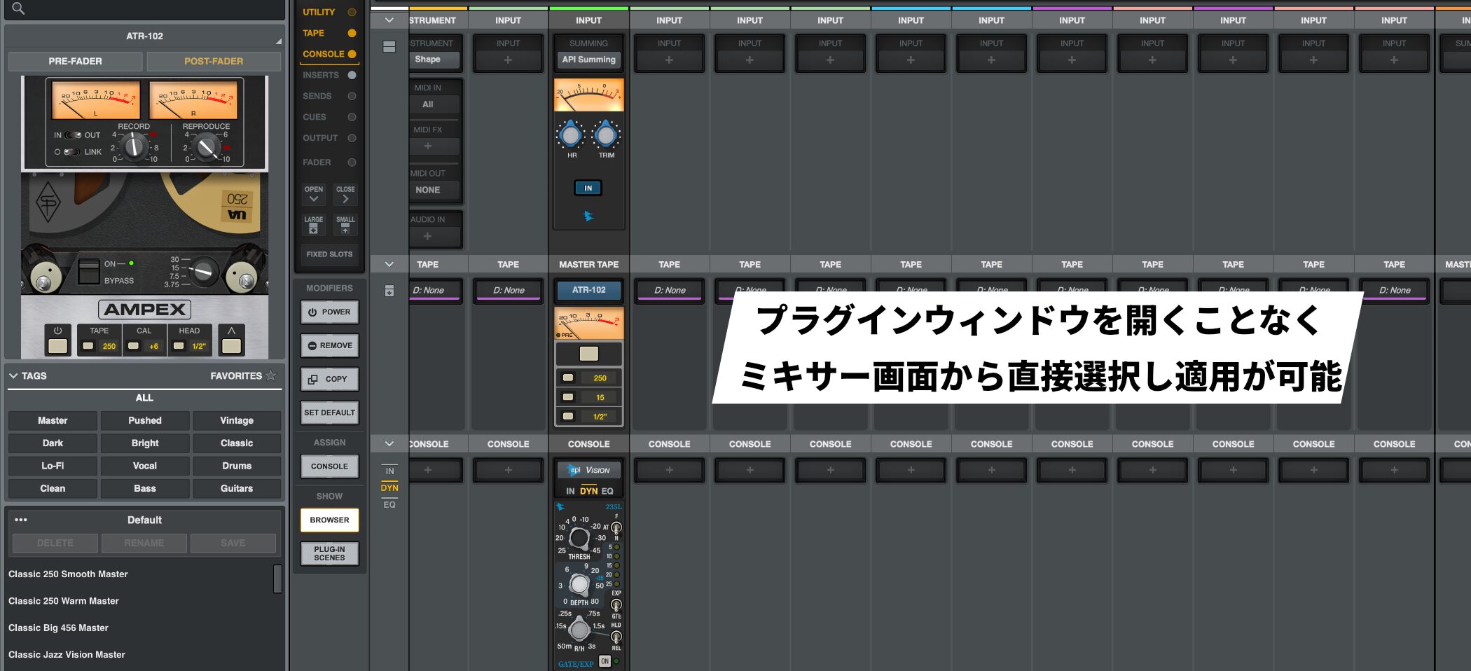 これにより、API、Studer、Ampexといった往年の名機のサウンド特性を、プラグインウィンドウを開くことなくミキサー画面から直接選択し適用できます。
