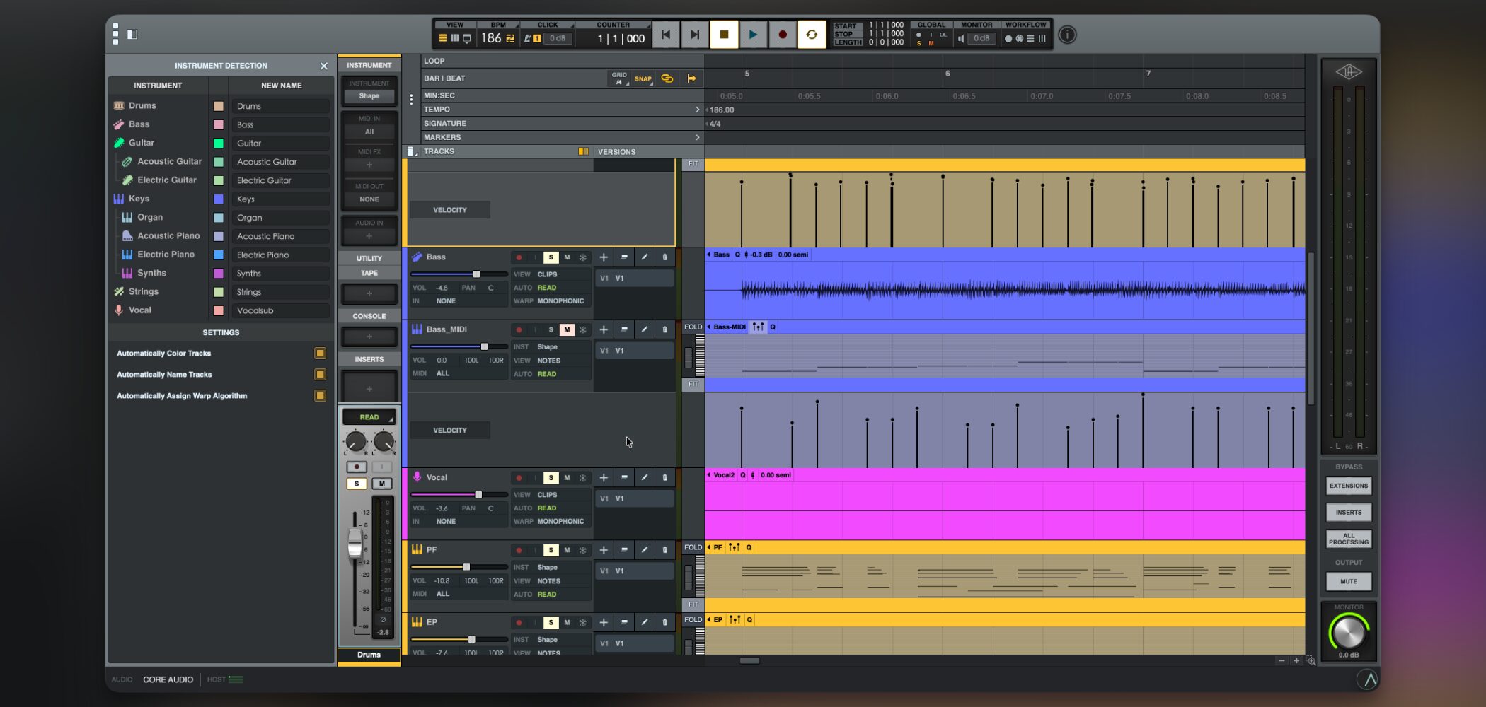 元のファイル名が「1」や「2」といった無関係なものであってもAIが音から解析を行うため、自動的に「Vocal」「Bass」「Drums」といった適切なクリップ名と楽器ごとのアイコンや色に変更されます。