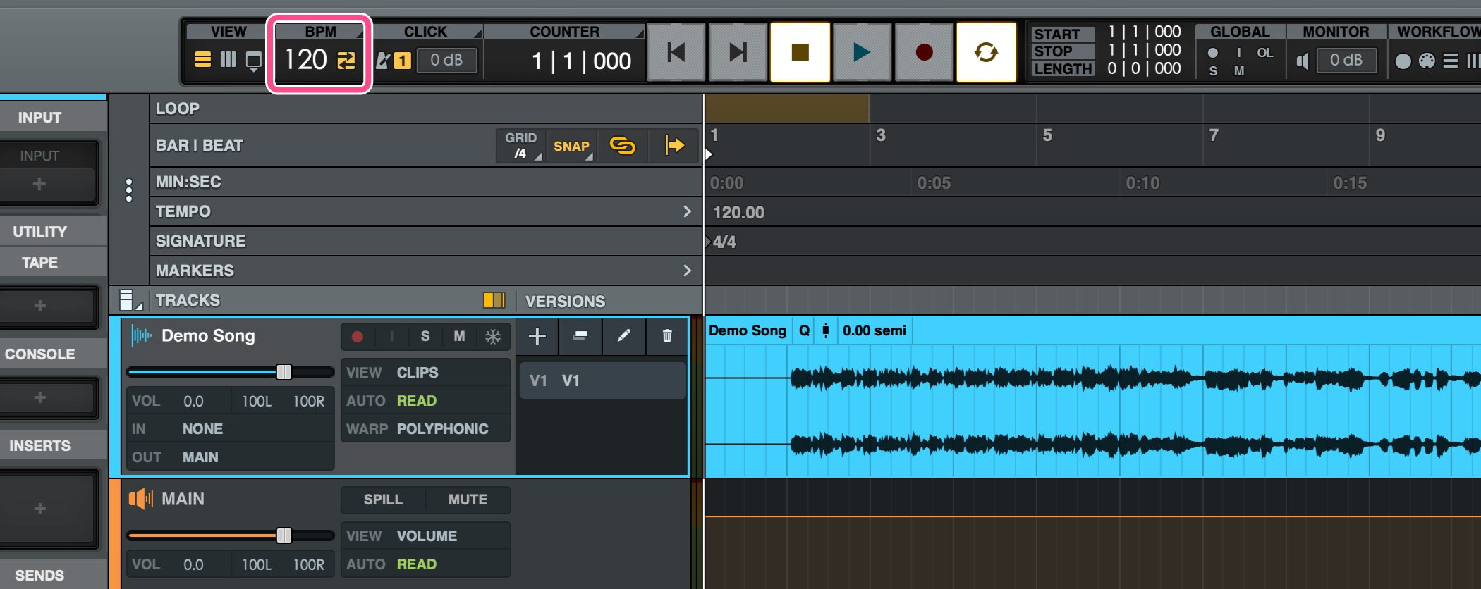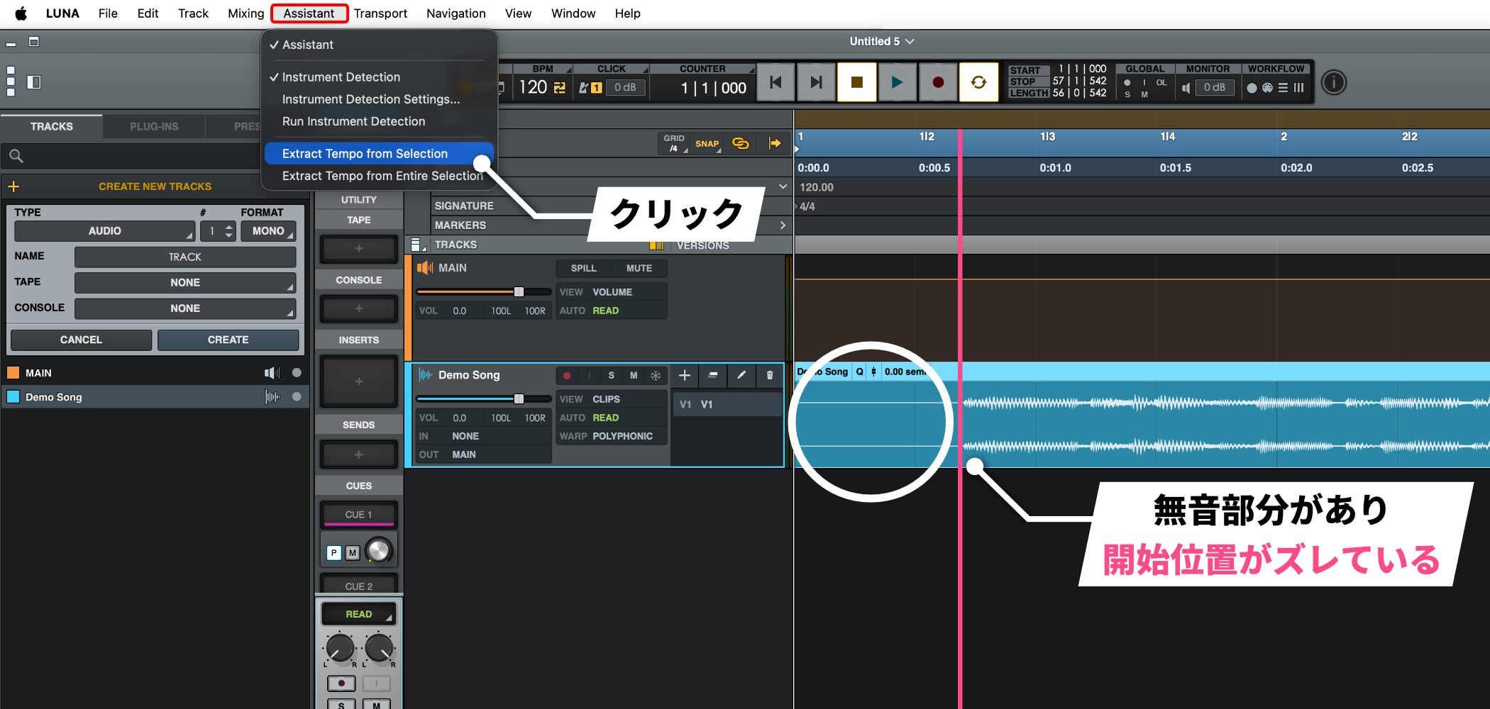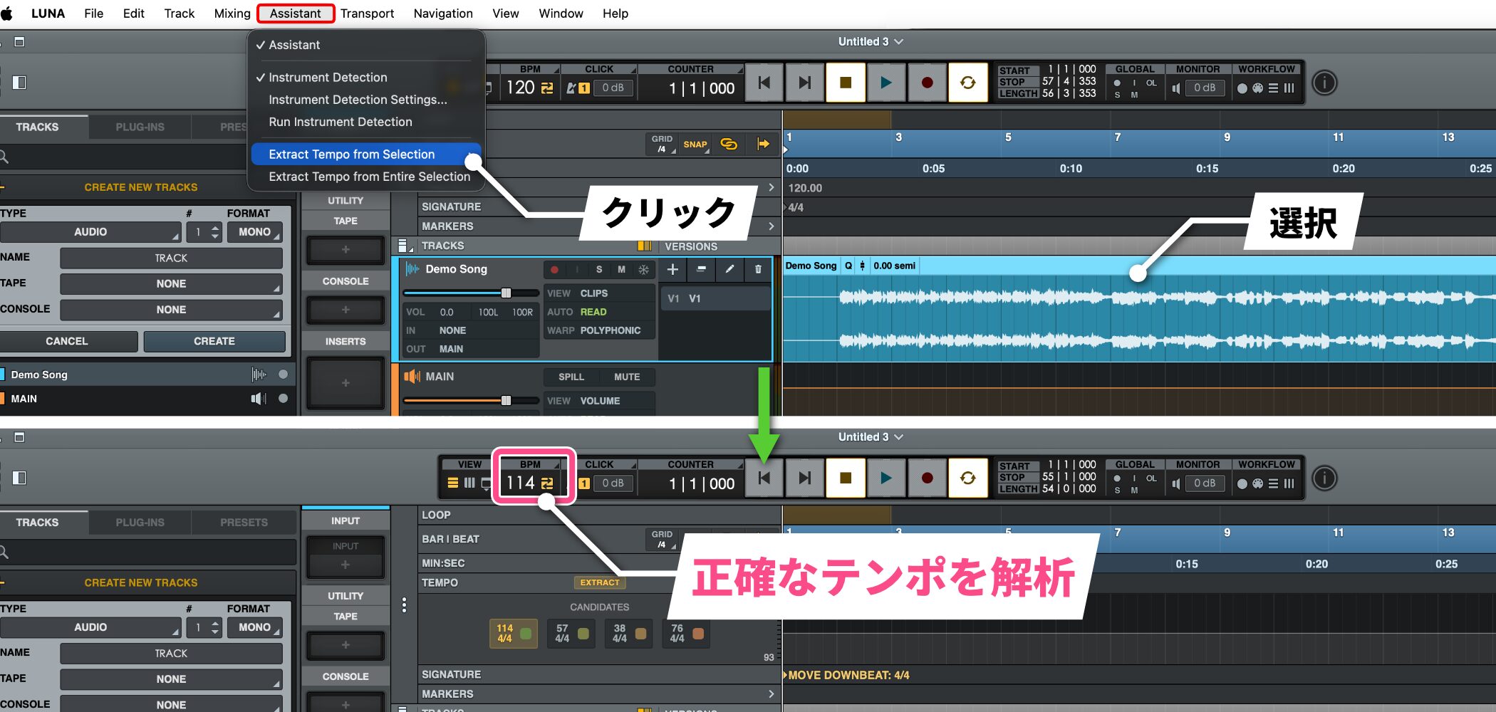 LUNA 2.0では、オーディオファイルを選択して上部メニューの「Assistant」から「Extract Tempo from Selection」を選ぶだけで、瞬時に正確なテンポを解析してくれます。