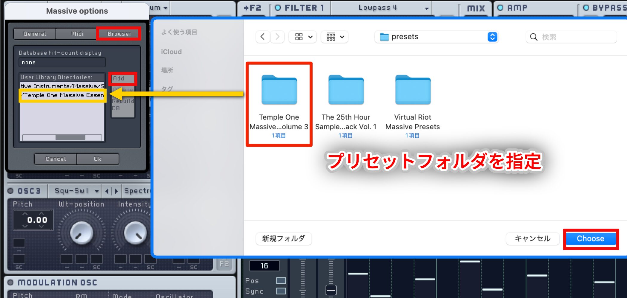 「Browserタブ」より「Add」をクリックし、プリセットが収められているフォルダを指定します。