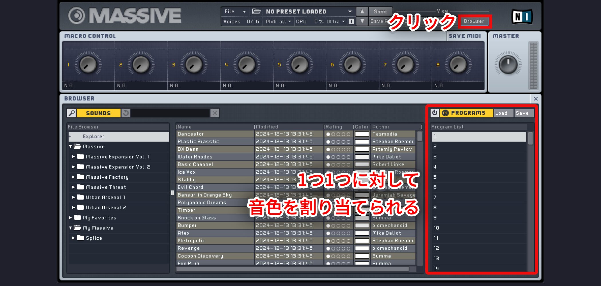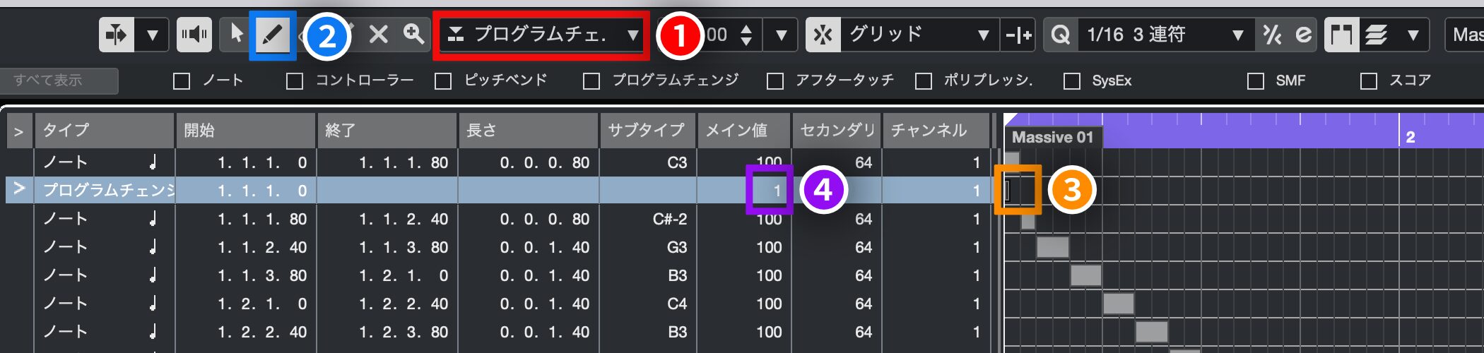 ④(紫): プリセットの番号を指定します(上記Massiveで音色を配置した番号)