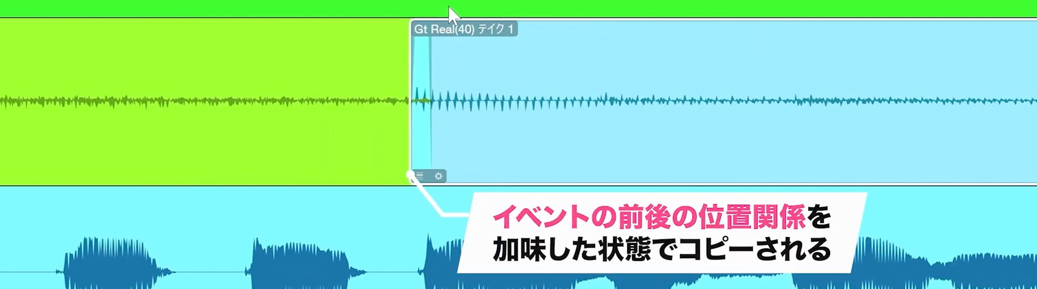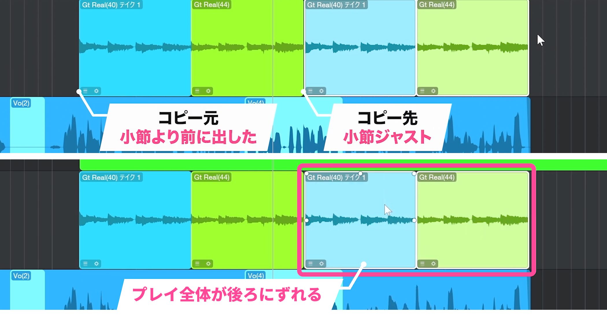つまり、コピー先ではプレイ全体が後ろにずれてしまうことになるため、最初のイベントが前に出ている分を加味しながらコピーする必要があります。