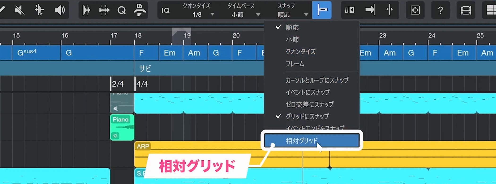 ギターのプレイのリズムが悪い場合は、MIDIの場合と同じ要領で、オーディオにもクオンタイズを適用可能です。