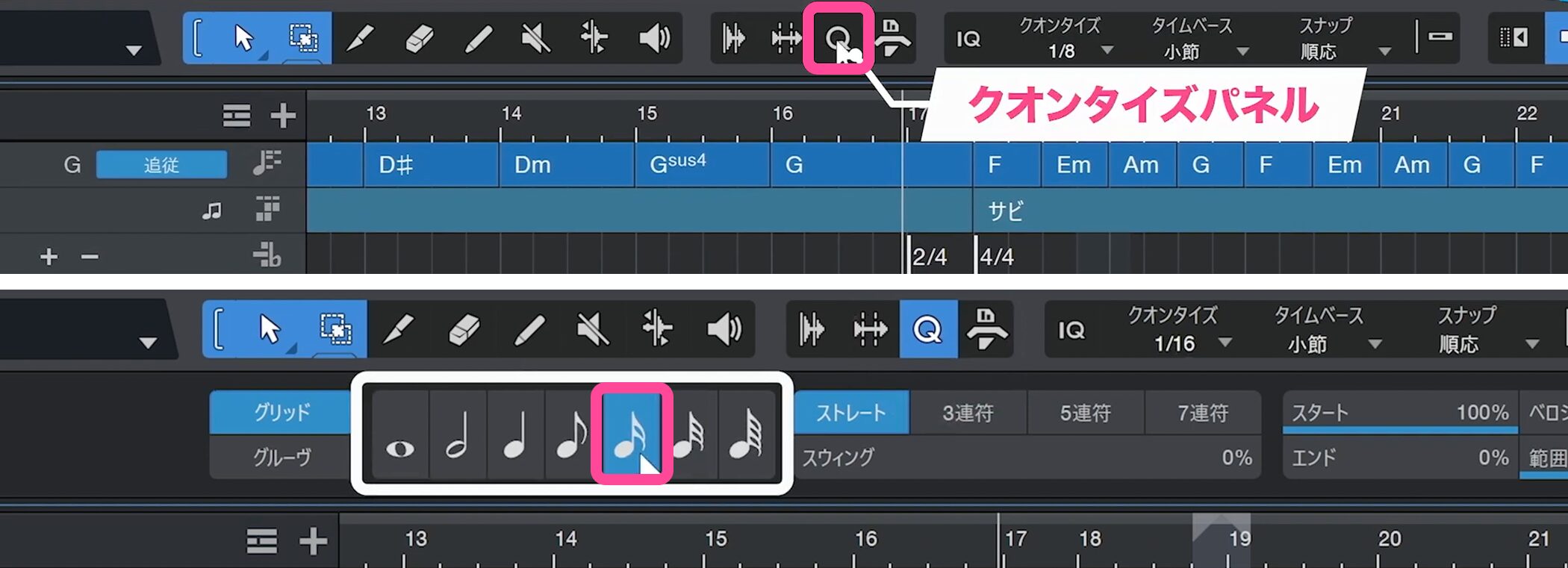 上にある「クオンタイズパネル」を開き、何分音符でクオンタイズするかを設定します。