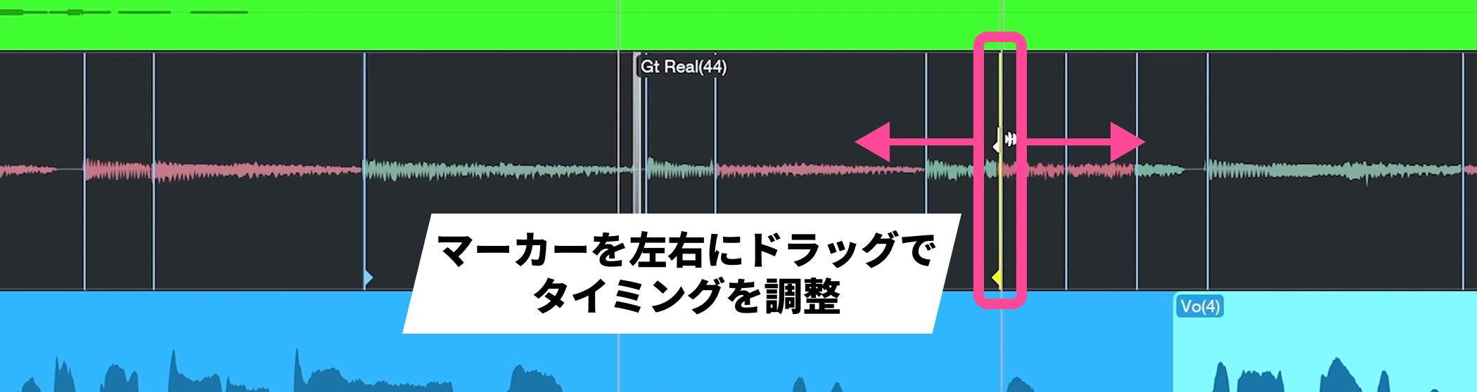 修正箇所を拡大し、ベンドツールでマーカーを左右にドラッグすると、タイミングを修正できます。