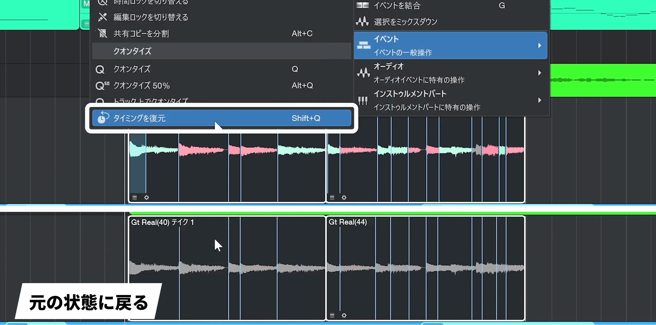 そのような場合はイベントを選択して右クリック、「イベント」の中から「タイミングを復元」を選択します。