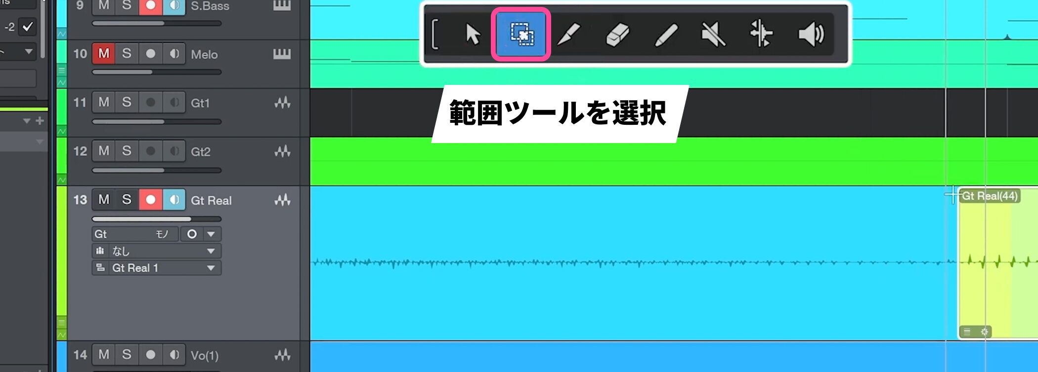 つなぎ目を整えるには、ツールから「範囲ツール」を選択します。