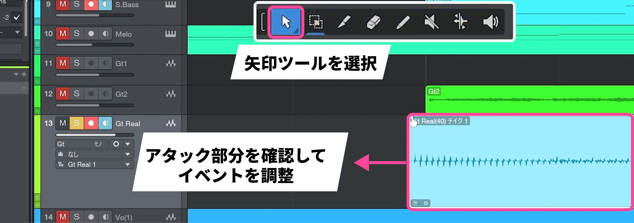 「矢印ツール」に変えて、アタックがしっかり出るところを探します。